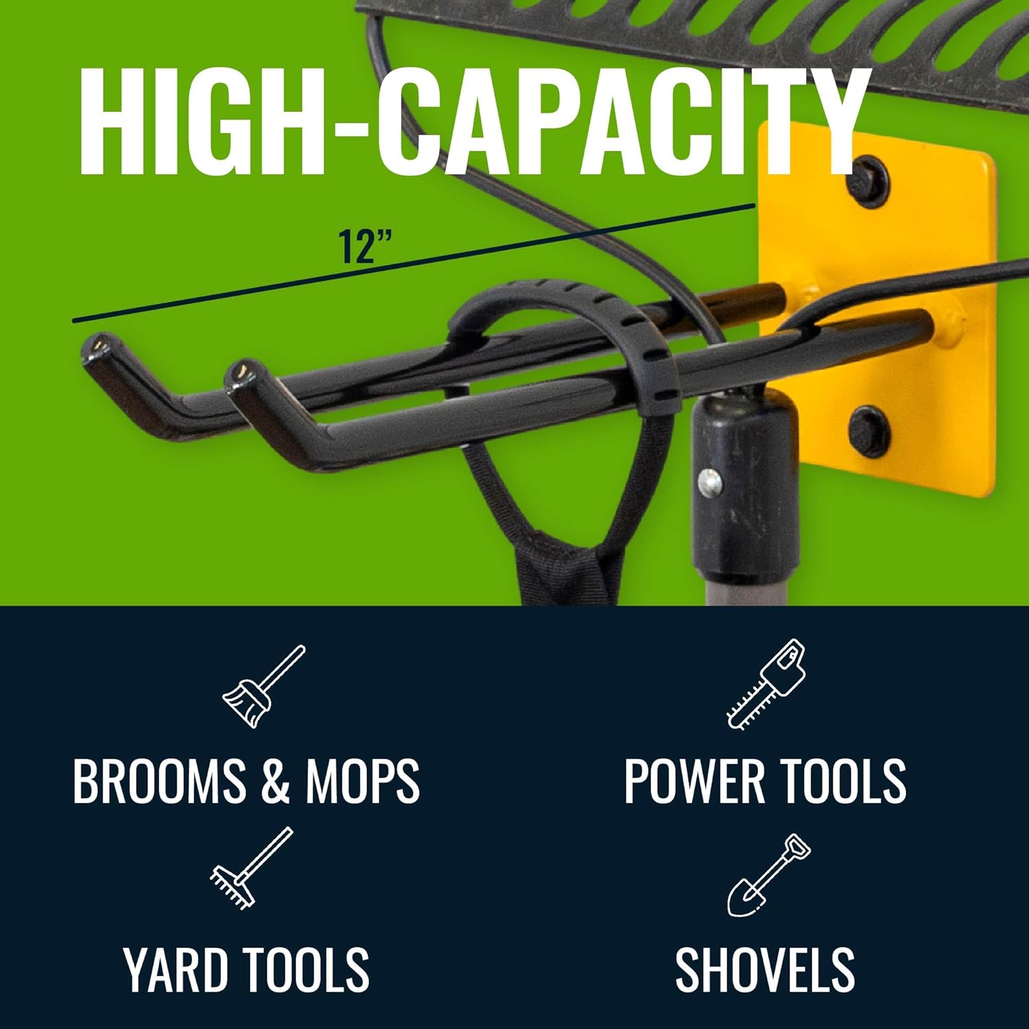 - Garage Wall Hanging Hooks – Universal wall mount storage hook measures 12.3"W x 4.5"D x 4"H to hold shovels, rakes, brooms, mops, garden hoses, extension cords, weed eaters, and much more.