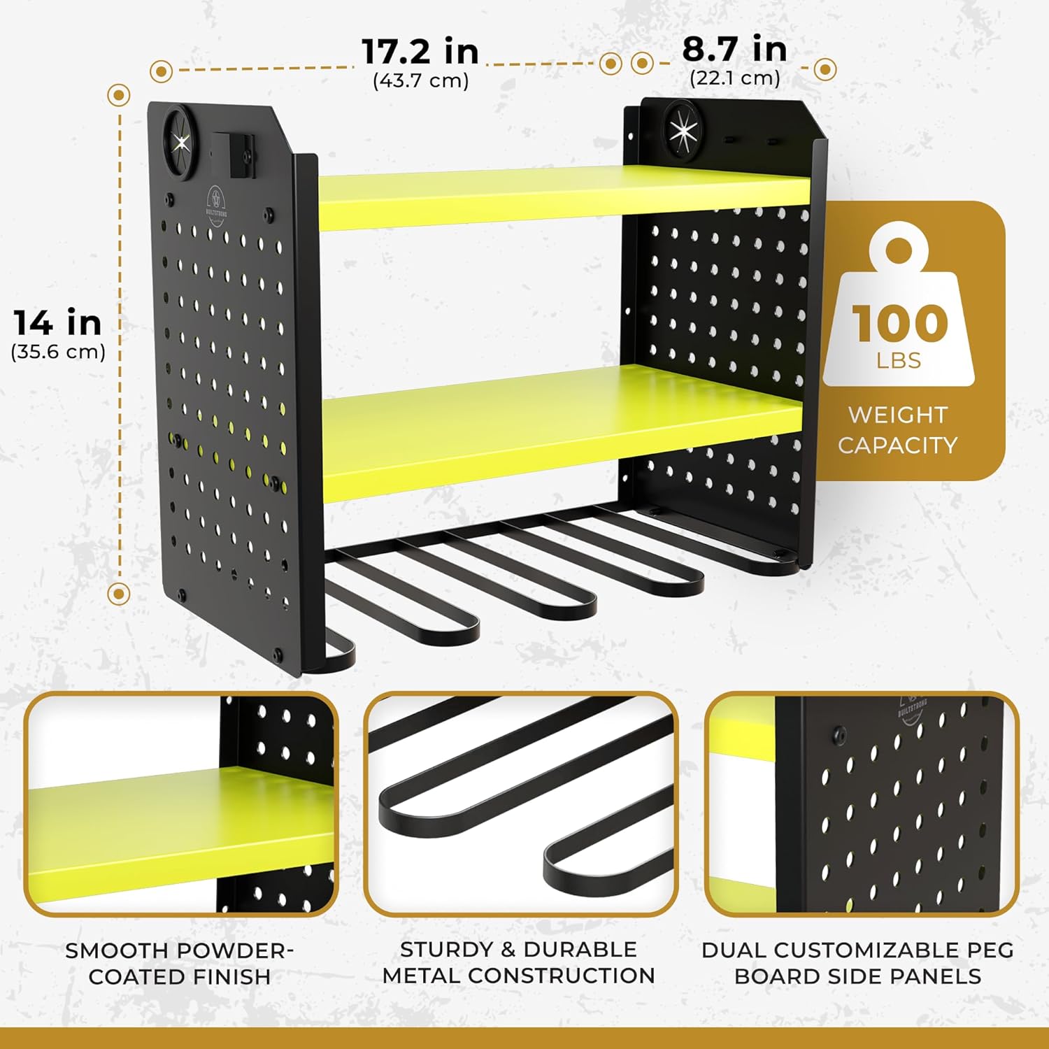 - PROFESSIONAL-GRADE DURABILITY let our tool organizers and storage shelves serve you for years on end. With a high-quality metal construction and beautiful powder-coated finish, this power tool holder stores, organizes, and looks great while doing it.