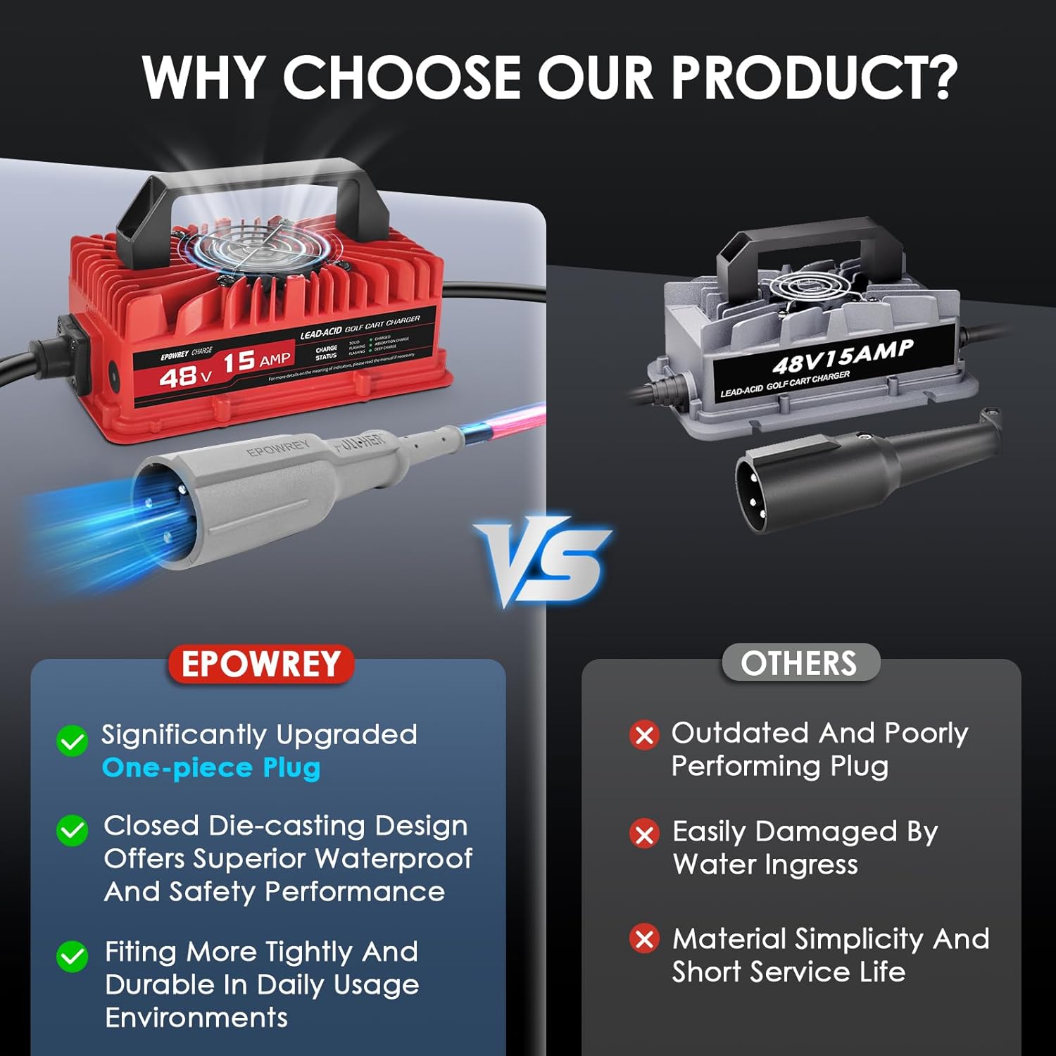 - 【15 Amp Rapid Charger/Lead-Acid】 EPOWREY 48 volt battery charger for Club Car golf carts with 3-pin round plug.This charger is designed as a one-piece plug, using a rubber cord that is more abrasion-resistant and heat-resistant than PVC cords, and have effective waterproofing advantage.