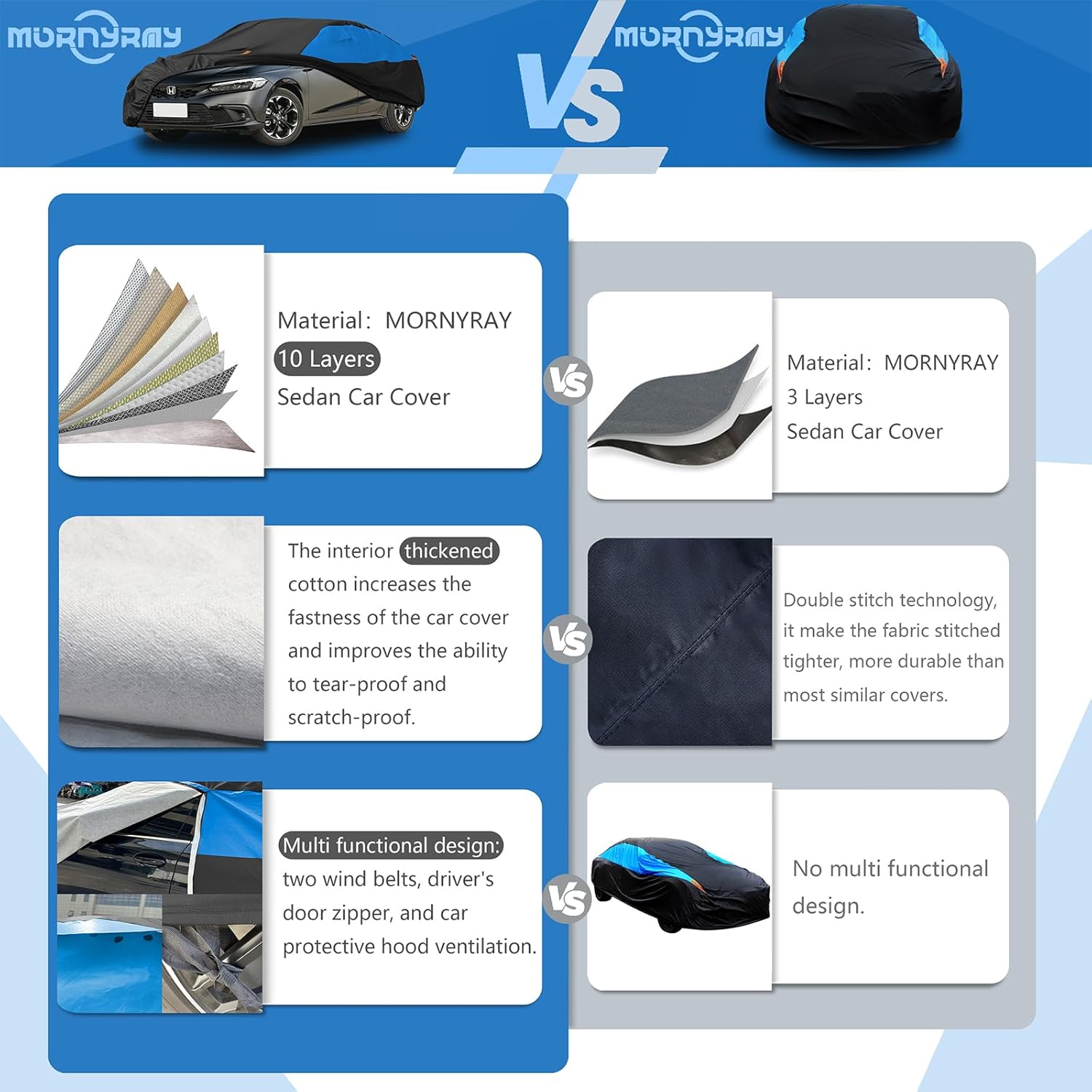 - Newly upgraded materials:1:MORNYRAY heavy duty car cover adopt 10 Layers of composite material. 2:The interior thickened cotton increases the fastness of the car cover and improves the ability to tear-proof and scratch-proof.3: The thickened PE material on the surface makes the cover 100% waterproof and breathable, while increasing the UV resistance to make the cover endure longer in extreme weather such as exposure to the sun, rain, snow and strong wind.