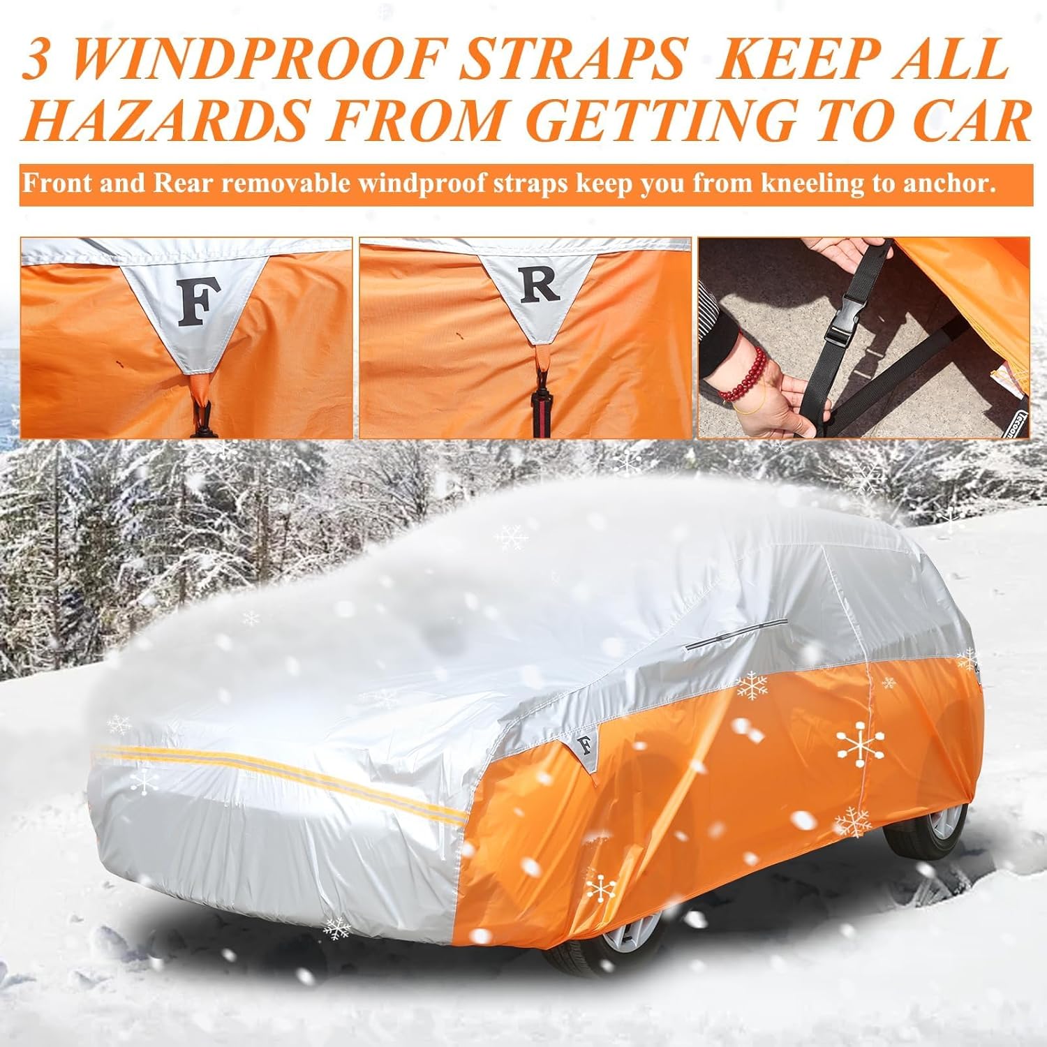 - VERIFY BEFORE PURCHASE - Please ensure your car details are correct before purchasing. Is it a sedan, hatchback, or SUV? What is the car's length? We offer a 12-month warranty. If you're unsure about the size or have any questions, feel free to reach out. We'll assist you promptly. (Our rain and snow car cover includes a portable storage bag.)