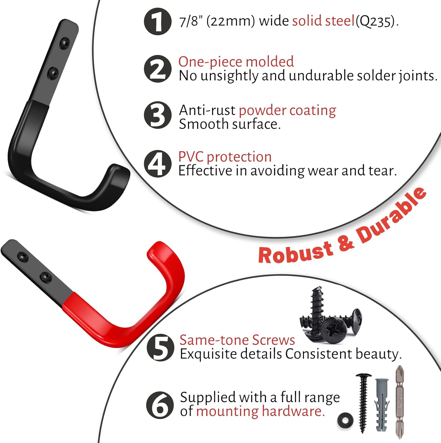 - EASY INSTALLATION: The garage wall hooks design is simple, allowing for quick and easy installation. It comes with detailed installation instructions and all the necessary mounting hardware, making it easy to install without requiring any professional skills