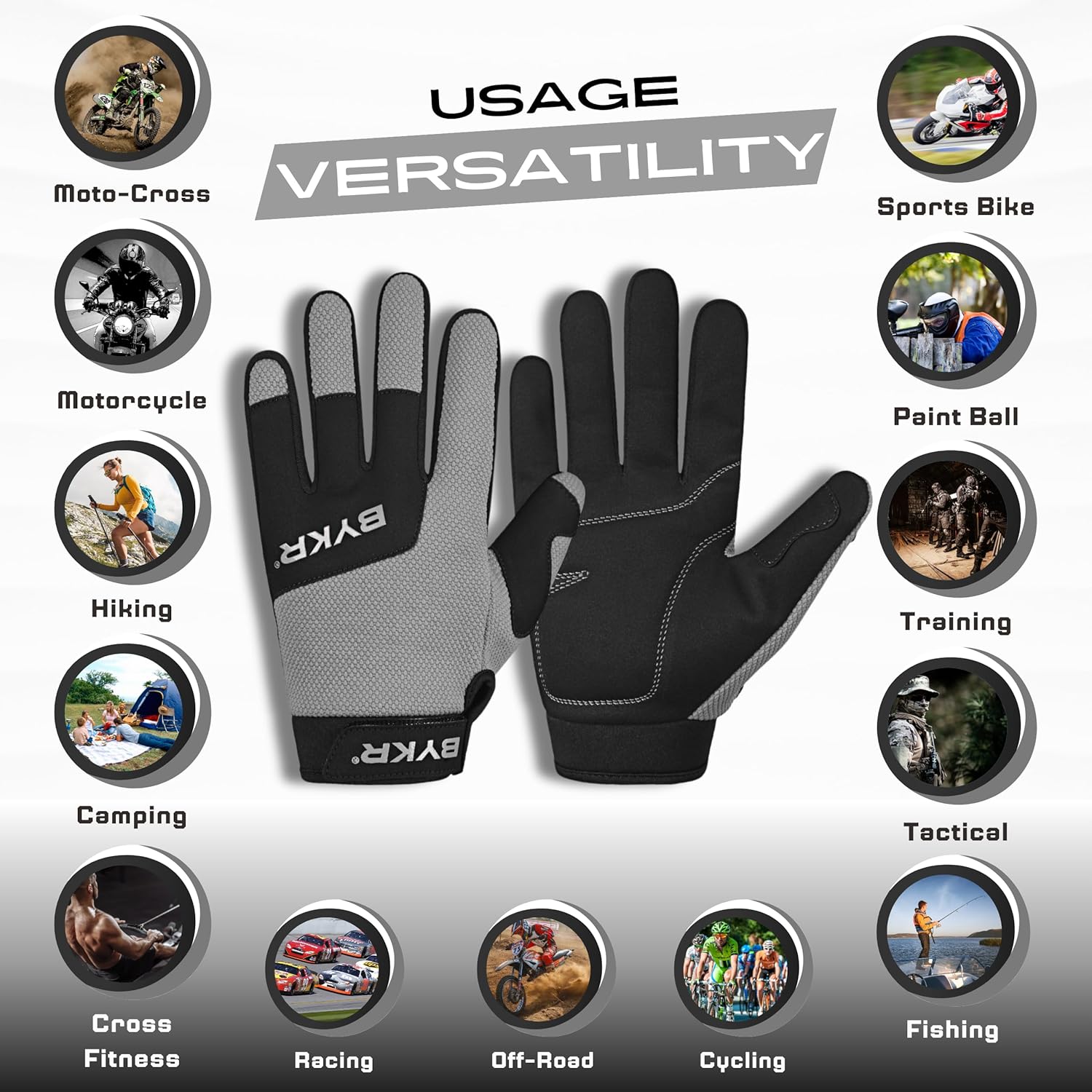 - SUPREME VERSATILITY: BYKR motocross gloves are all purpose and can be used for all types of outdoor adventure sports such as dirt bike gloves, mechanic gloves, dual sport gloves, atv gloves, motorcycle riding gloves, motocross gloves, tactical gloves, cycling gloves, MTB gloves, ski gloves & also as car driving gloves.