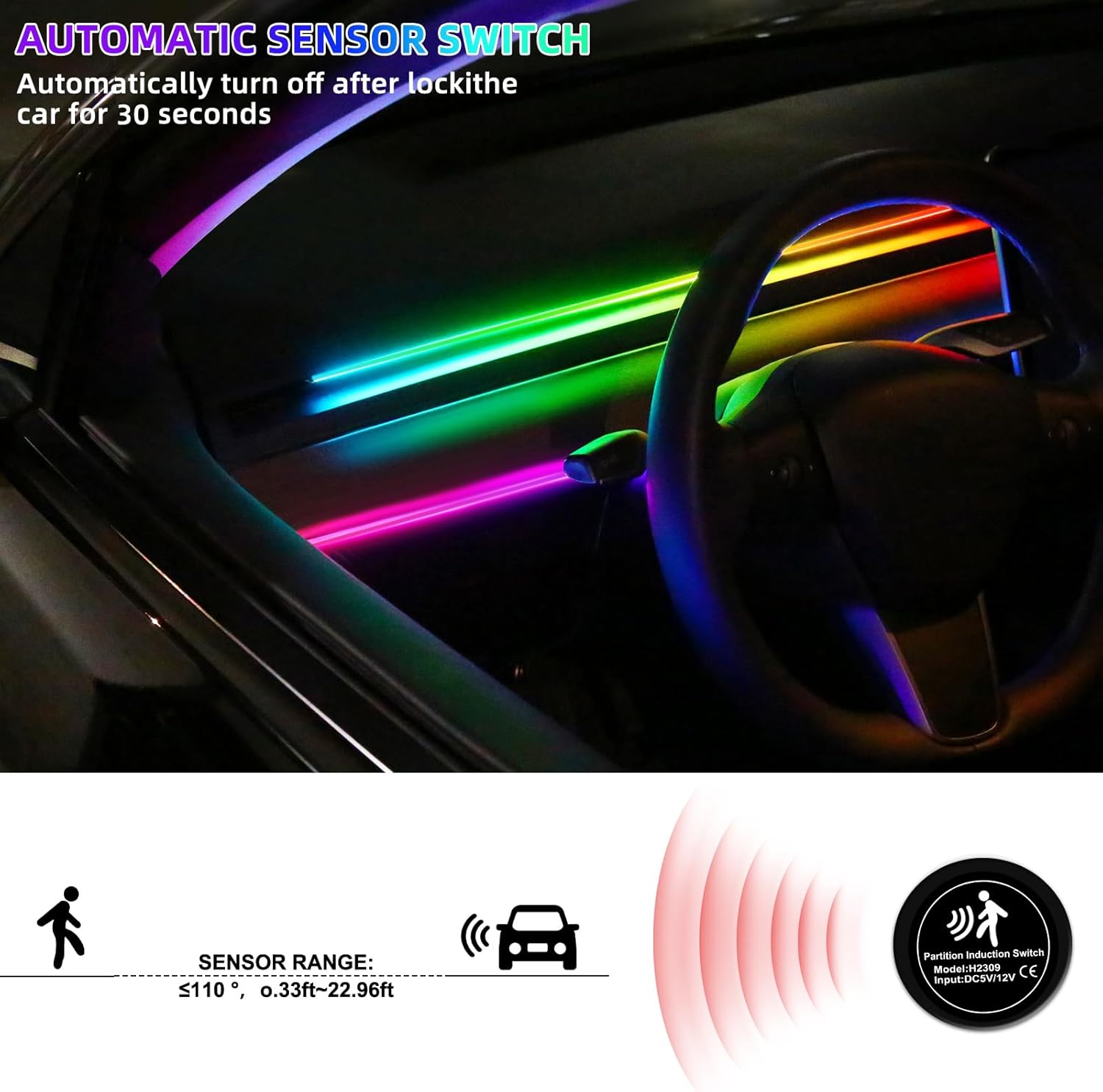Dream+Color Acrylic Interior Car LED Strip Light with Motion Sensor Switch, 55.1 inches Neon LED Strip Light, RGB Colors Ambient Lighting Kits