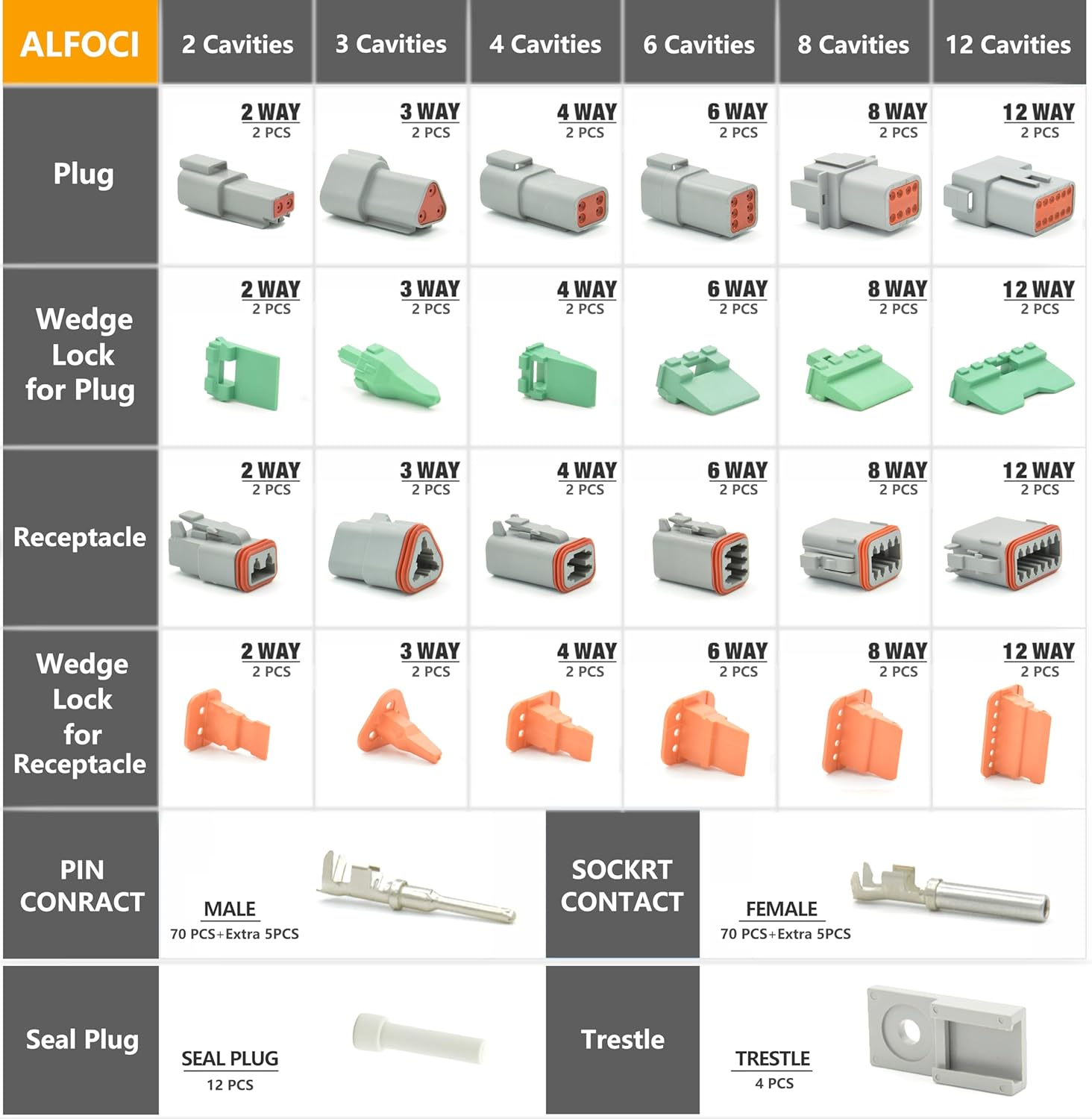 - ✅ALFOCI DEUTSCH CONNECTOR KIT INCLUDE: 2 sets 2 3 4 6 8 12-pin Deutsch connector kit with 75 pairs (extra 5 pcs) of stamped terminals (pin-socket contacts). 12 pcs sealing plugs and 4 pcs trestle.【Refer to the 5th picture for installation steps】