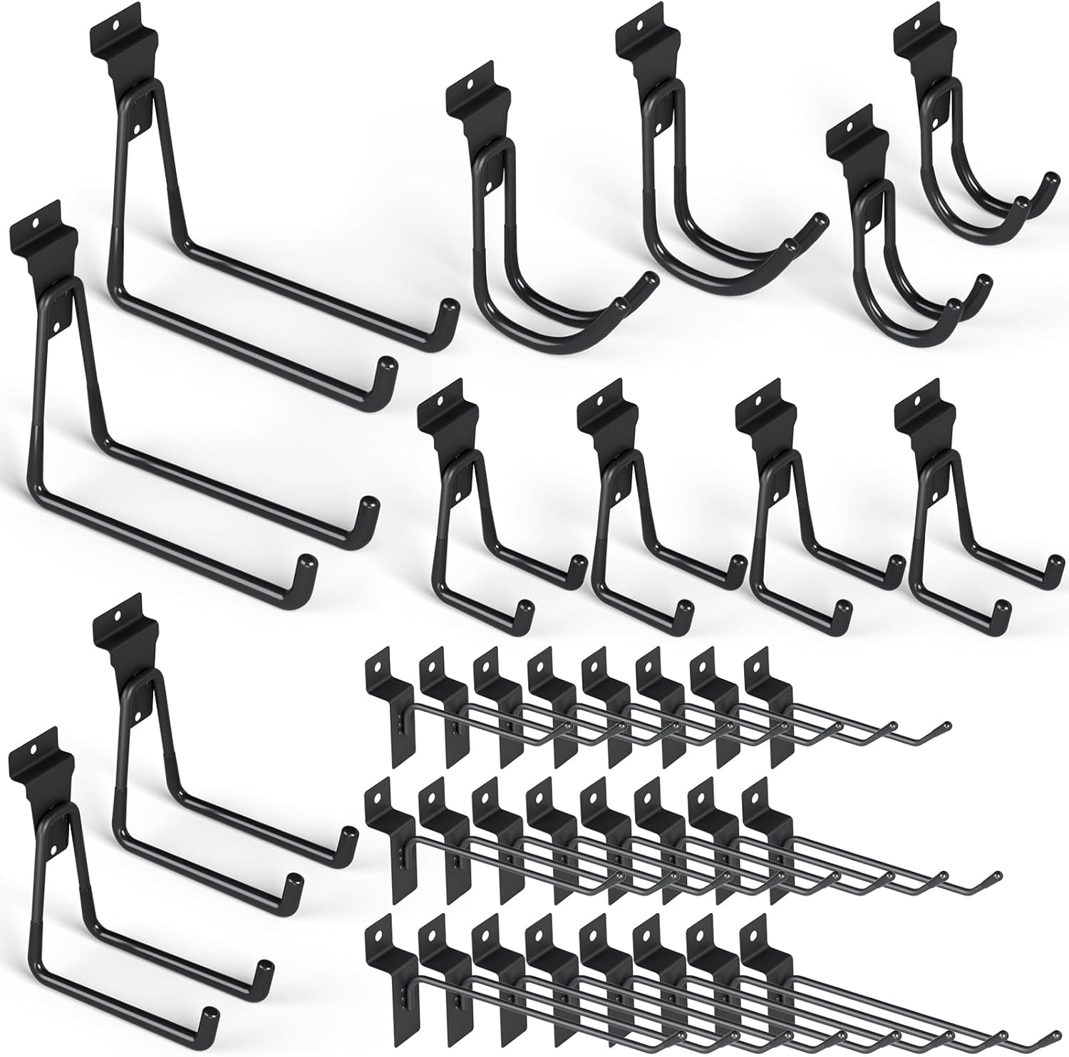 - VALUDED PACKAGE: The slat wall accessories set comes with 36 pack heavy duty slatwall hooks, 4 x Small U Hook, 2 x Medium U Hook, 2 x Medium U Hook, 2 x Small J Hook, 2 x Large J Hook, 8 pieces of 4 inch hooks, 8 pieces of 6 inch hooks, and 8 pieces of 8 inch hooks