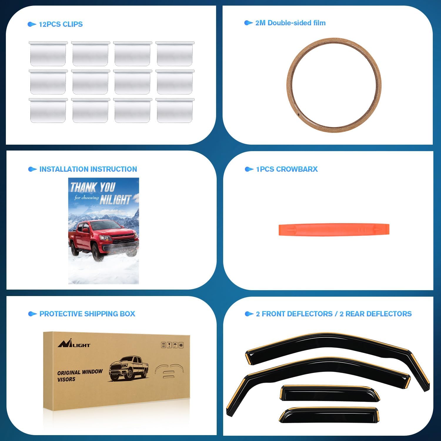 - QUICK AND EASY INSTALL: Nilight Wind Deflectors provides perfect fit for your Car. Just slip it onto your car’s window and your job is done within minutes. There is no drilling or no tools required