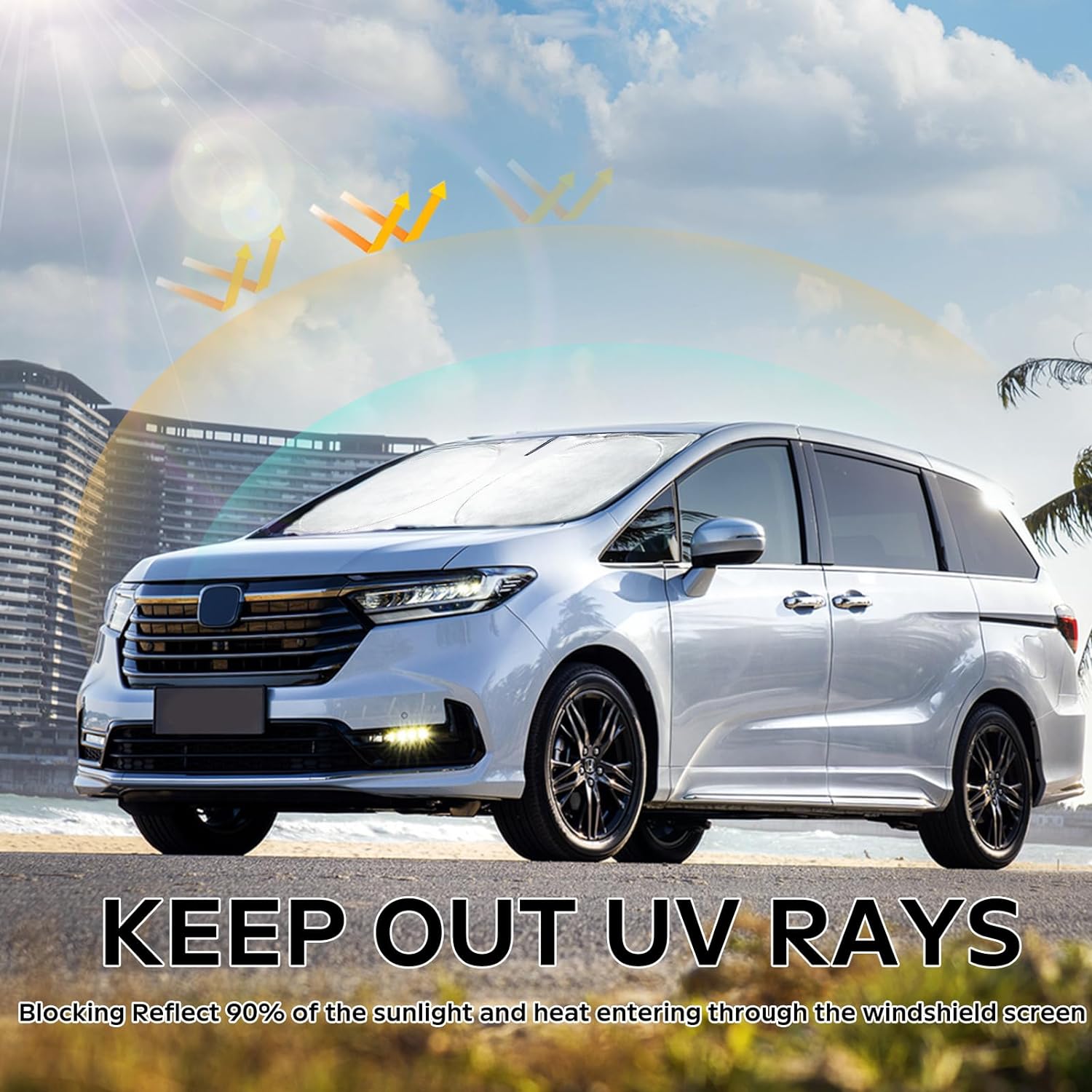 - ✿[Block UV Shield Protector]Fit for Honda Odyssey sunshade it is made of 210T polyester fabric with UV reflective material, two -layer heat insulation and 99% SPF, which can avoid the spicy sunshine in summer. it can be fully shaded and no need to worry the high temperature in summer. must have for honda Odyssey Mini Van accessories. Constructed with double layers of heat shield fabric, this windshield visor sun shade acts as a barrier against the sun's intense rays, keeping your car cool during hot summer days.