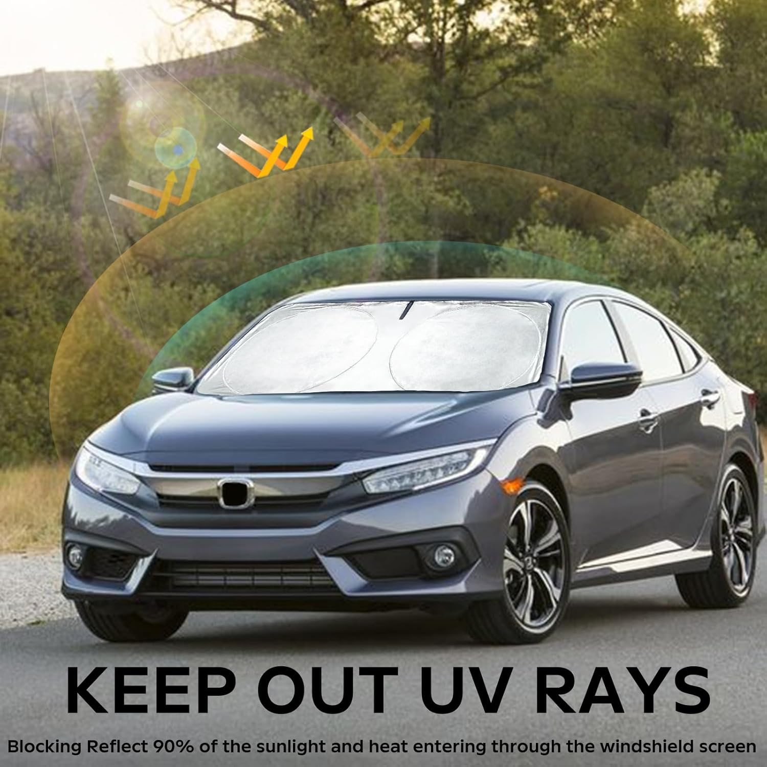 - [Windshield Heat Shield Cover for civic]:Extreme UV rays often cause fading, cracking, and serious damage to your car interior, with Car Sunshade, you will surely have a long lasting and beautiful car interior for years! 2-layers material, effectively block 99% UV rays and heat, reducing temperature by up to 50-59°F. Keep your vehicle inside cool and prevents the inside of your car from over-heating.