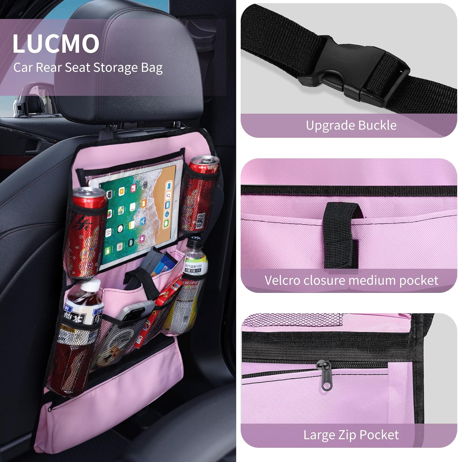 - 【Premium Material】LUCMO car seat organizer is made of high quality polyester with perfect waterproof property and good durability. Making your car looks very luxurious! Besides, it protects the back of your car seat from dust, abrasion and kicking dirts.