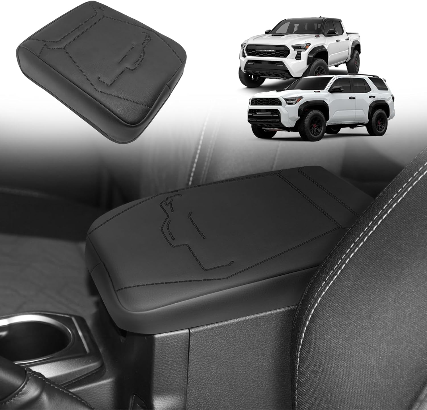 Muslogy Center Console Armrest Cover Compatible with 2024 Toyota Tacoma 2025+ 4Runner Accessories Armrest Lid Protector Vegan Leather Cushion Regular Thick(Black/Black Stitching)