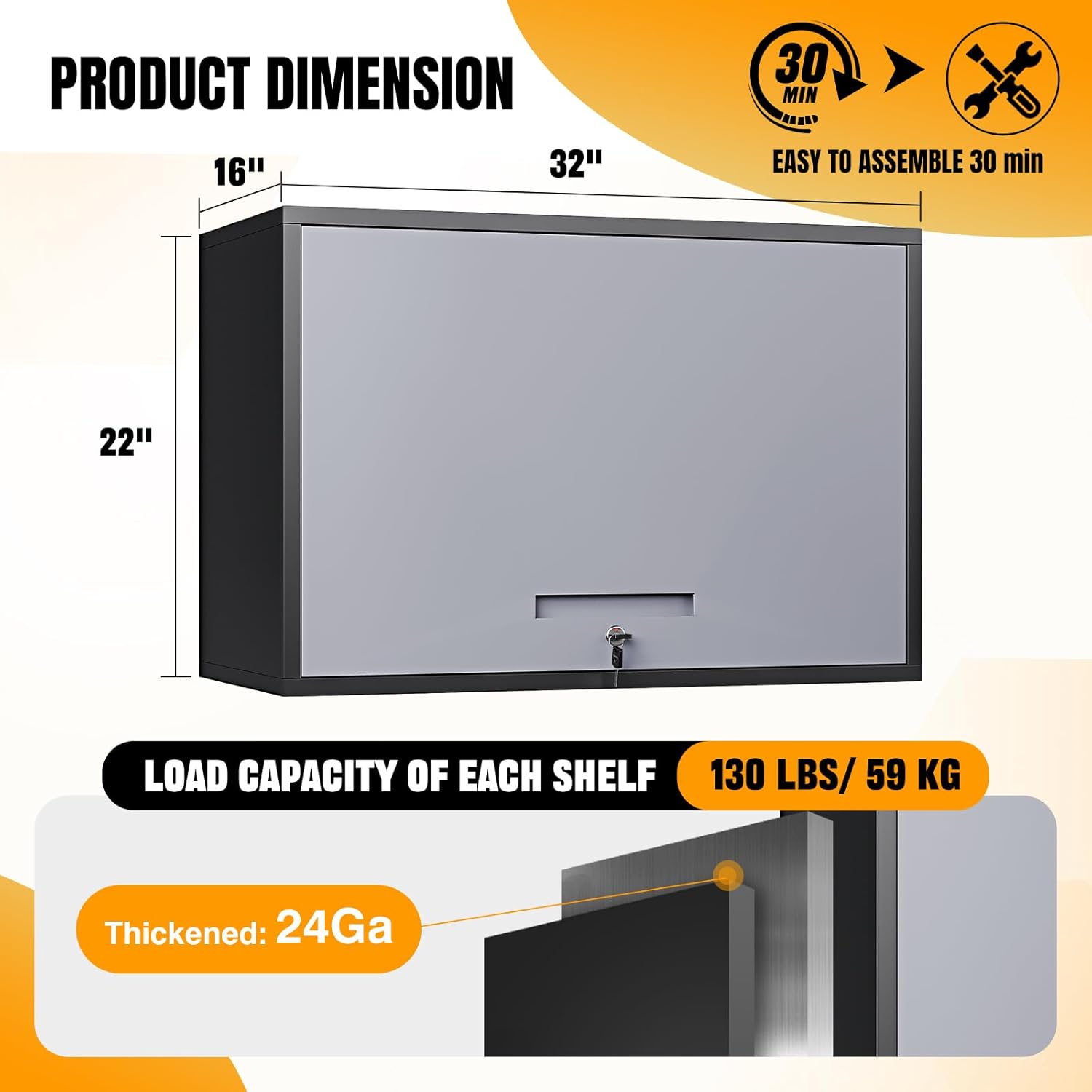 - ✅➤【High quality wall cabinet】:The Floating Metal Garage Cabinet is made of pressed sheet metal 0.65 mm SPCC steel plate. It is sturdy, and the steel is powder coated, which helps prevent rust. The robust steel construction can support up to 130 lbs for each shelf.