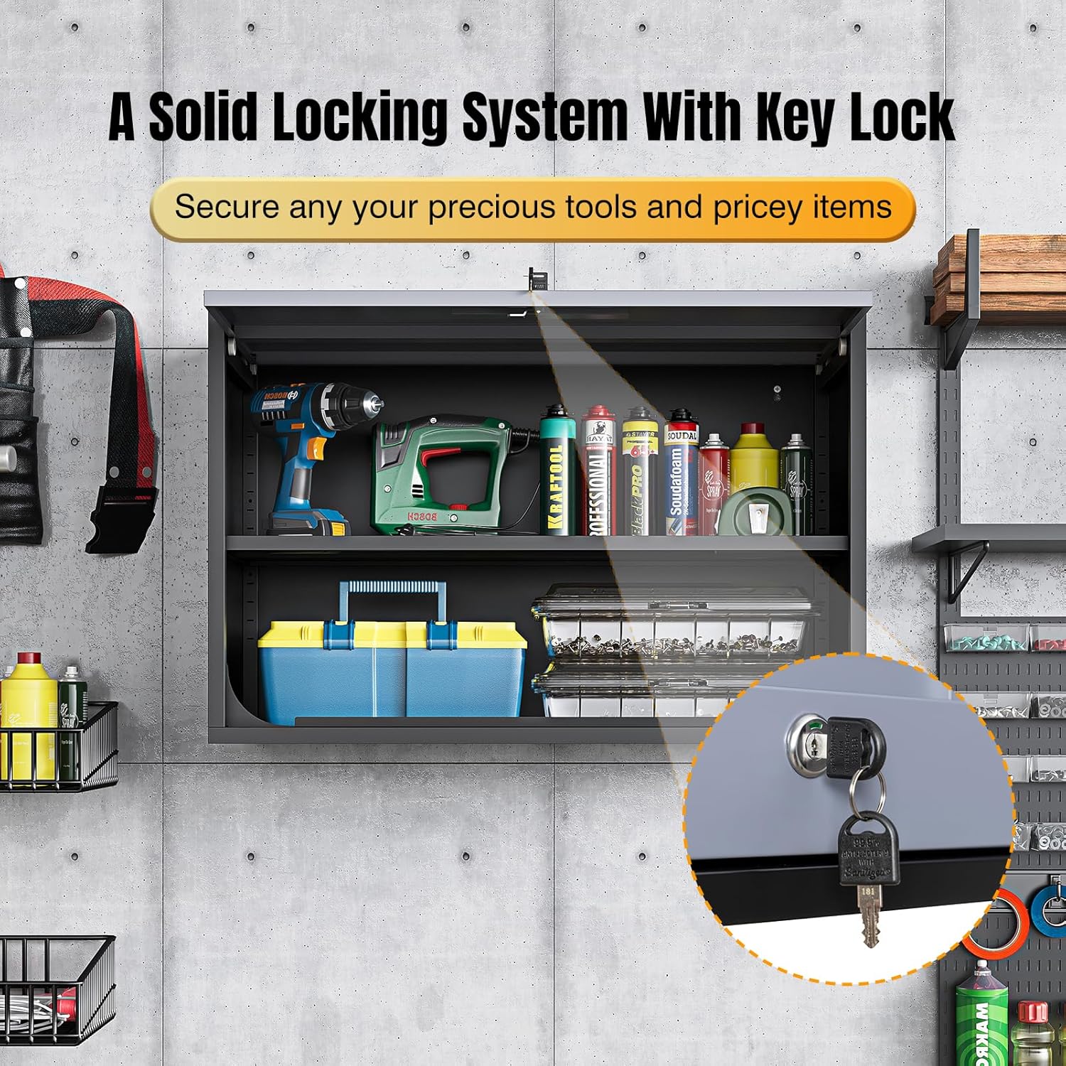 - ✅➤【A solid locking system】: This wall storage cabinet comes with a lock with 2 keys, which is a plus to secure any important and pricey items that you are storing. The lockable feature is the cherry on top, ensuring your precious tools are safe from pesky tool gnomes.