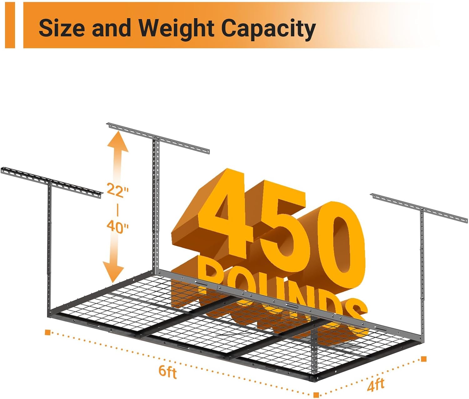 - Large Capacity: The 4x6ft overhead garage storage rack combines a weight-bearing capacity of 450 pounds, which provides a reliable storage solution.