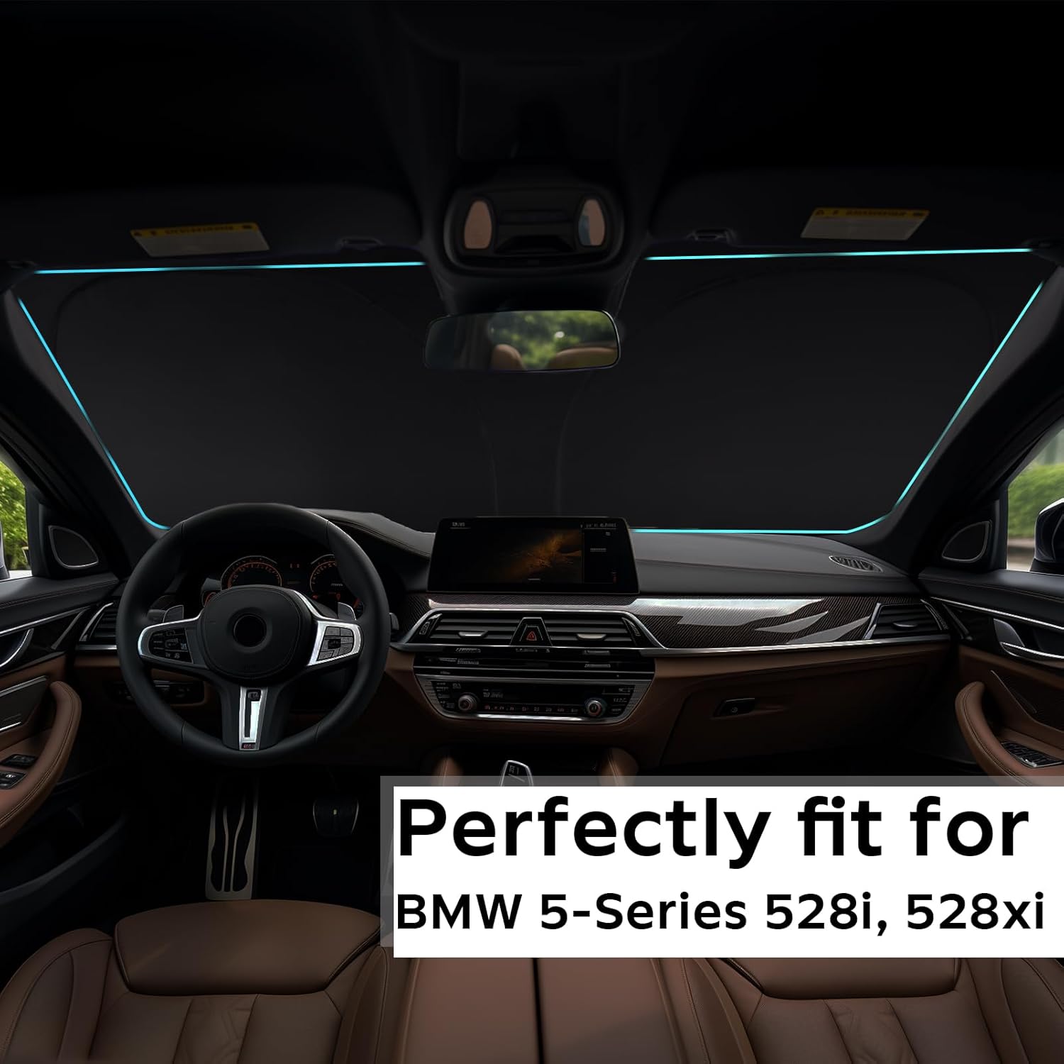 - ☀︎【Vehicle Specific】Windshield Shade Cover custom fit for BMW 5 Series 2018 2019 2020 2021 2022 2023 2024, for BMW 5-Series 525i, 525xi, 528i, 528xi, 530i, 530e, 530xi, 535i, 535xi, 545i, 550i. Full covered your windshield,No Gap,100% Perfect fit. Its custom cut design and reinforced steel rings ensure a secure fit well.