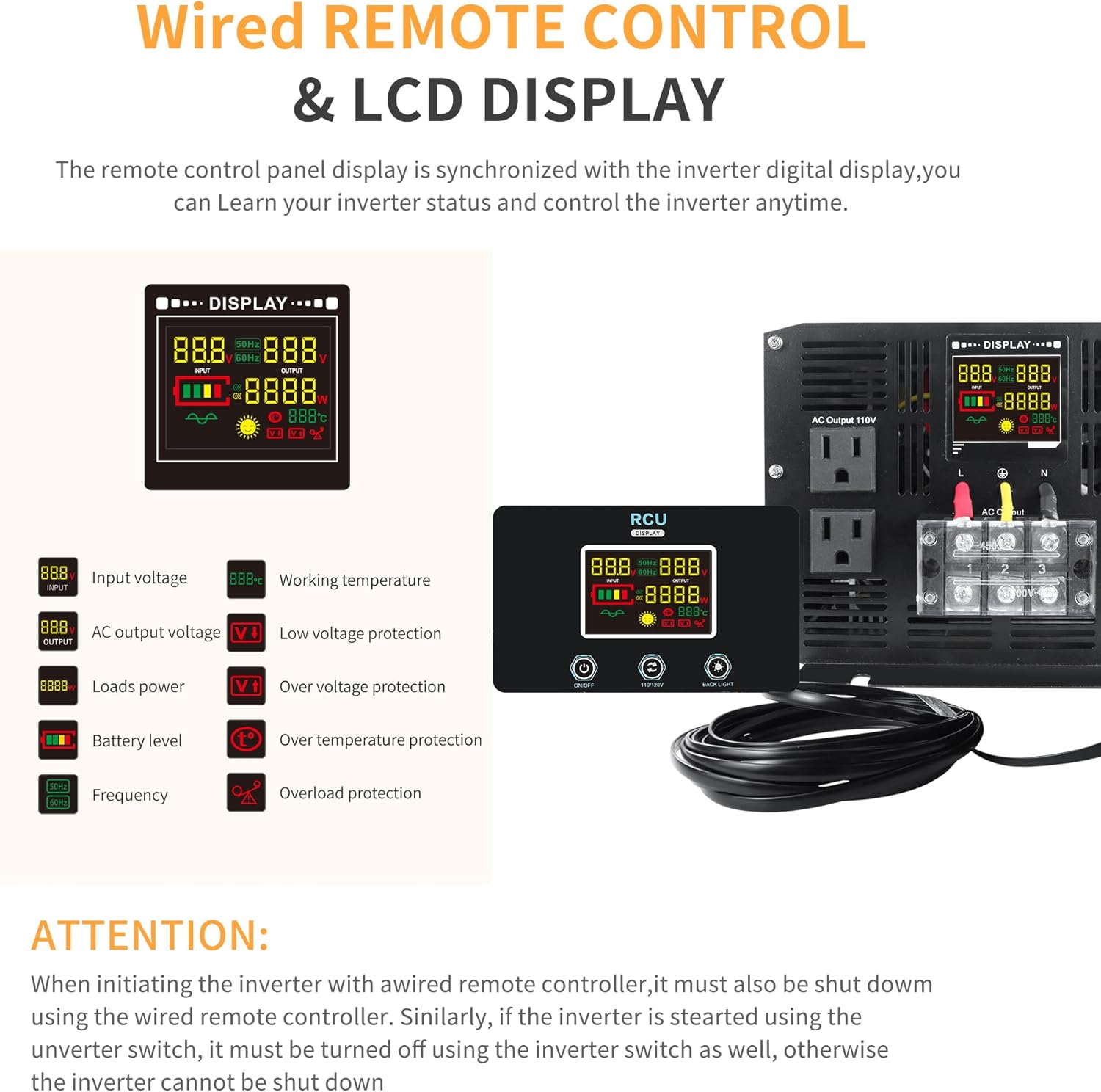 - 【LCD Display & Wired Remote Control】 The 12V power inverter displays real-time input and output voltage, providing clearer and more important usage status information (battery voltage and output power). A wired remote control is more convenient to operate a pure sine wave inverter