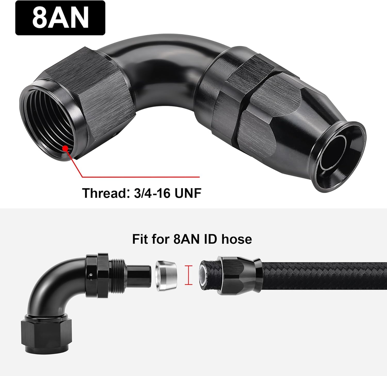 - [Product Size & Parameter] Size: 8AN. Thread Size: 3/4-16 UNF. Working Pressure: 1500PSI. Working Temperature Range: -40°F-250°F. Angle: 90 Degrees. Note: Please verify the hose size before purchase.