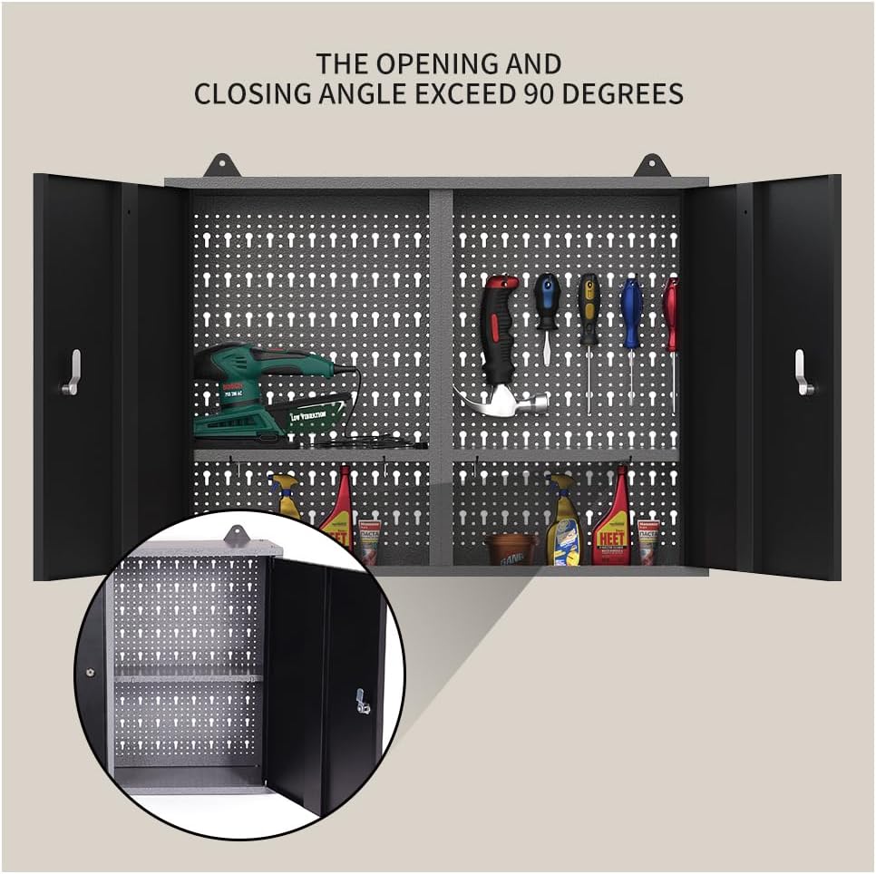 - 【Functional Layout】Within the upper cabinet, a pegboard enables efficient tool storage, promoting both organization and visual appeal. Additionally, the shelves are removable, offering adaptability to accommodate changing needs.