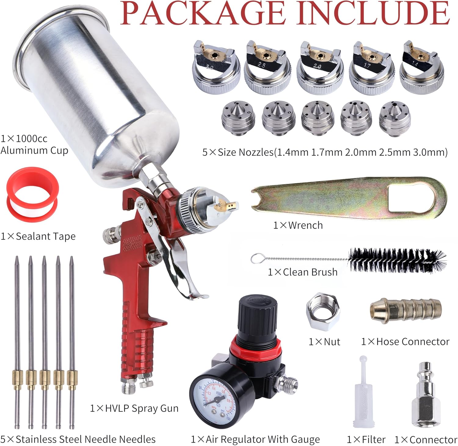 HVLP Spray Paint Gun, Automotive Gravity Feed Paint Gun Kit with 5 Nozzles,1.4mm 1.7mm 2.0mm 2.5mm and 3.0mm, 1000cc Aluminum Cup, Suitable for Auto Paint, Painting Cars