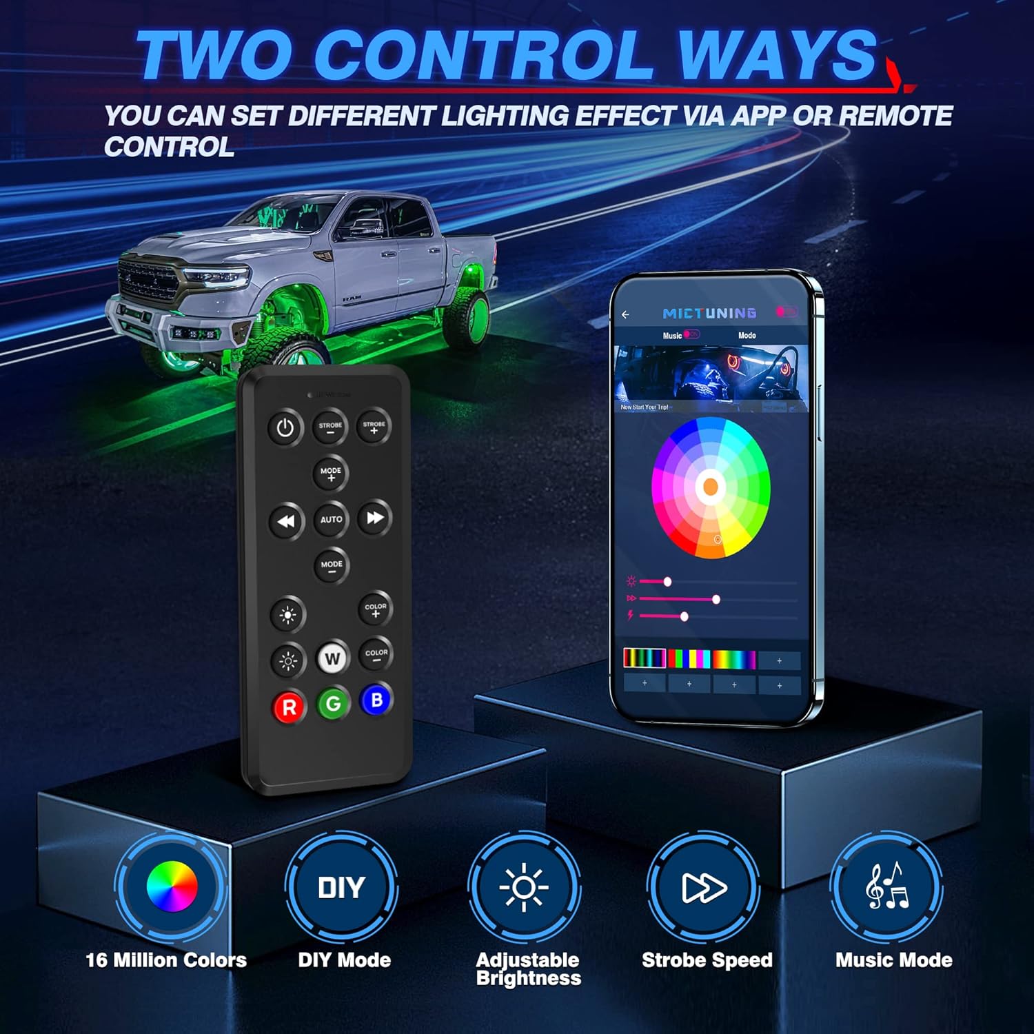 - ★【Dual Control Modes】Command your lights like a boss! Use the included remote or MICTUNING EXCLUSIVE MagicLink APP (iOS/Android) to connect multiple lights of SAME TYPE to control. You can combine both RGBW type of Q1 C1 C2 C3 K1 K2 S1 to control together)—ONE app rules all! Surprise: Crank up the ‘Music Mode’ and let your rig party to the beat