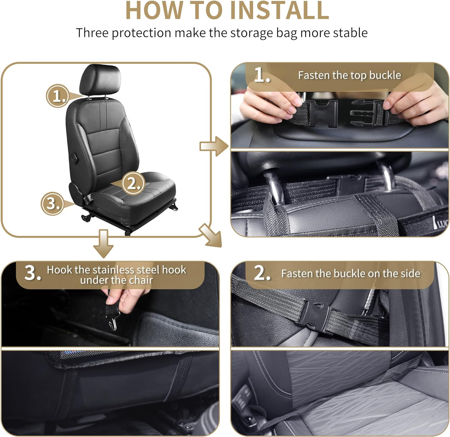 - 【Premium Material】LUCMO car seat organizer is made of high quality polyester with perfect waterproof property and good durability. Making your car looks very luxurious! Besides, it protects the back of your car seat from dust, abrasion and kicking dirts.