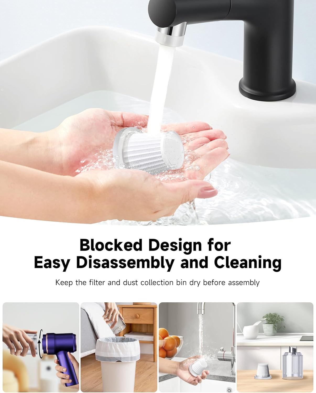 - 【Advanced HEPA Filtration & Easy Maintenance】This handheld vacuum uses an efficient, washable HEPA filter trapping 99% dust/allergens. Keeps air cleaner & protects motor, extending life. As a small vacuum cleaner, its user-friendly design means dust cup and HEPA filter detach easily for simple rinsing. Ensure parts are fully dry before re-installing to maintain peak suction & filtration. Easy upkeep for lasting power.