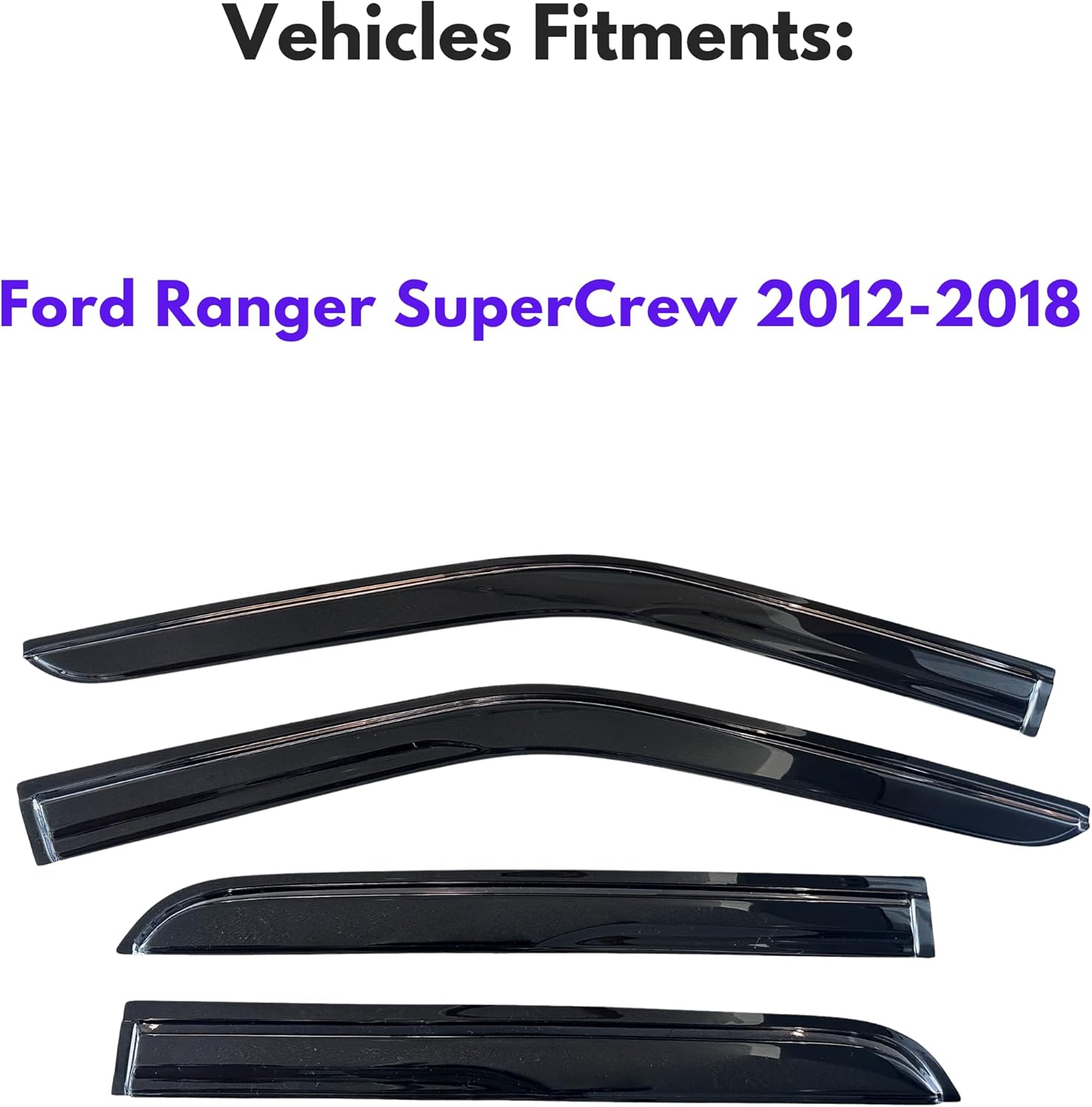 KPY Window Visor Compatible with Ford Ranger SuperCrew 2012-2018, 4PC Rain Guard Side Window Vent Deflectors Tape-On Mugen Style, 2012 2013 2014 2015 2016 2017 2018