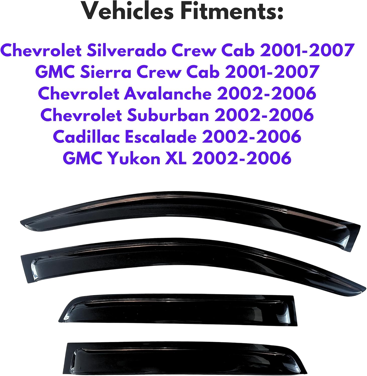 KPY Window Visor Compatible with 2001-2007 Chevy Chevrolet Silverado/GMC Sierra Crew Cab, 2002-2006 Avalanche/Suburban/Escalade EXT/Yukon XL, Rain Guard Side Vent Deflector 2002 2003 2004 2005 2006