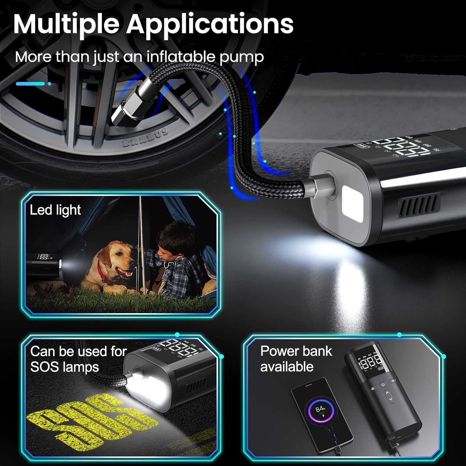 - LARGE CAPACITY: The all-in-one portable air compressor for car tires that allows you to pump 4 vehicle tires, 18 motorcycles, 28 bicycles, 150 balls and other inflatables anywhere while working as a portable charger to charge phones, tablets, MacBooks and etc. Extended battery life is hassle free for you to enjoy its cordless convenience without worrying about running out of battery.