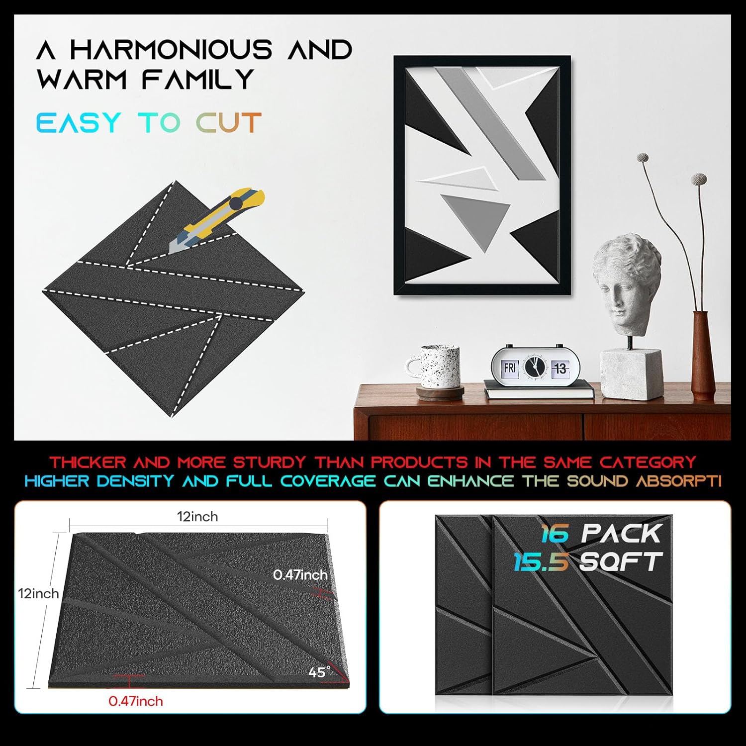 16 Pack Self-Adhesive Soundproof Wall Panels, 12 x 12 x 0.47 In Sound Proof Foam Panels for Walls, 1.2lb/ft³ High Density, Thicker 0.47in, Acoustic Panels, Noise Dampening Panels Studio Black