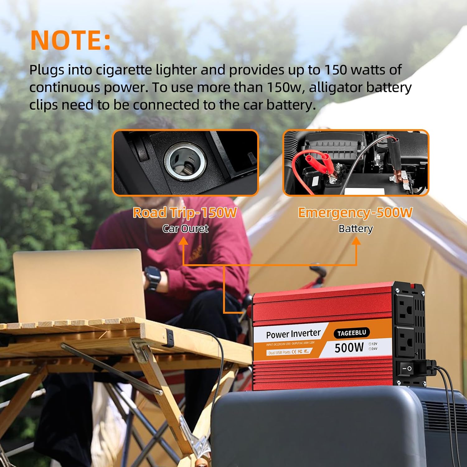 - 【Travel and Emergency Equipment】 This converter is suitable for road trips, camping, outdoor work. It can also power lights, routers, fans by connecting a deep-cycle battery during power outage
