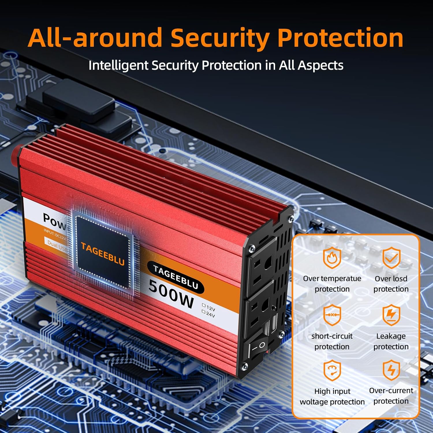 500W Power Inverter DC 12V to 110V/120V AC Car Inverter with 2 x 3.0A USB Ports and Dual AC Outlet, Equipped with 1 Cigarette Lighter and 2 Battery Clamps for Road Trip and Camping