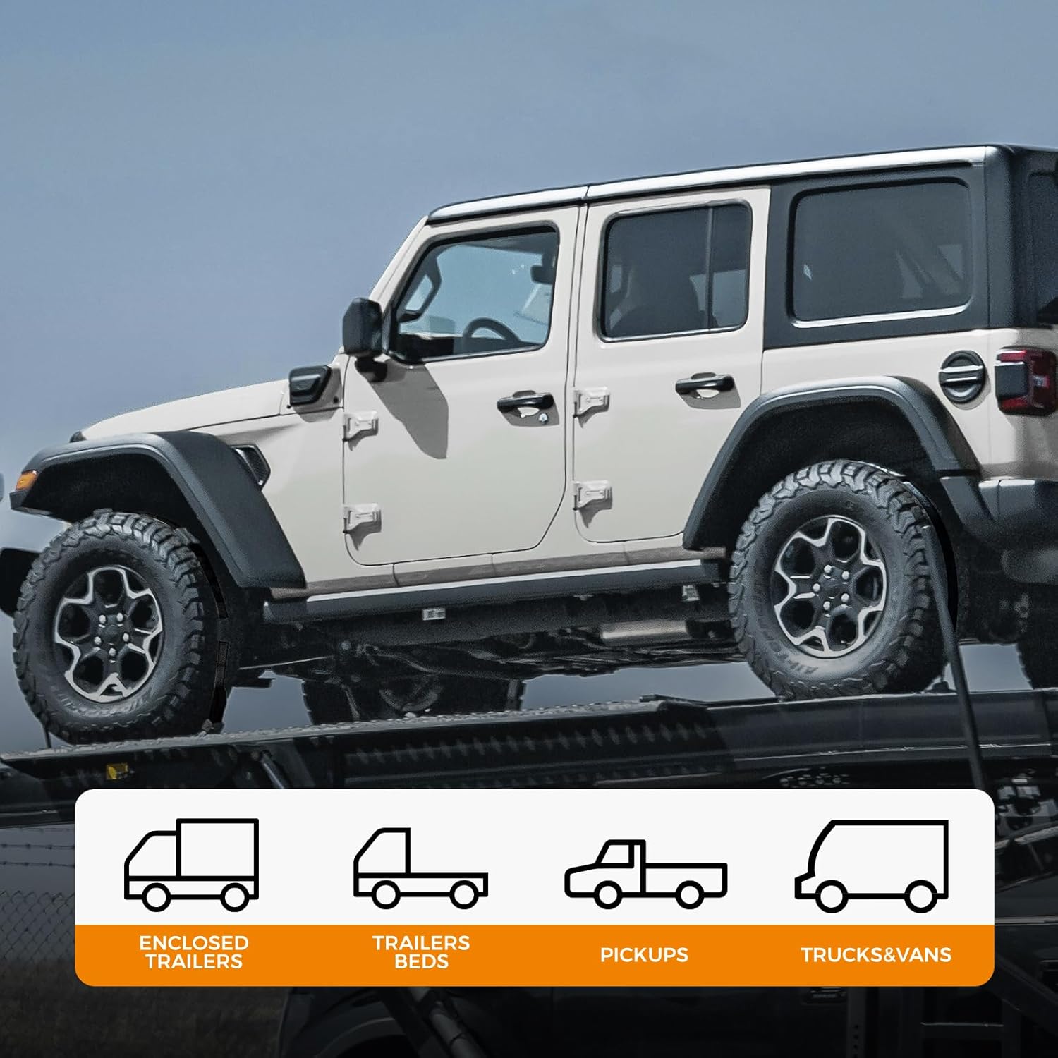 - BUILT TO LAST: Car trailer tie down straps heavy duty is designed with industrial grade polyester webbing, trailer straps using tough abrasion edge to added car hauler straps protection against wear and tear for maximum strength and durability