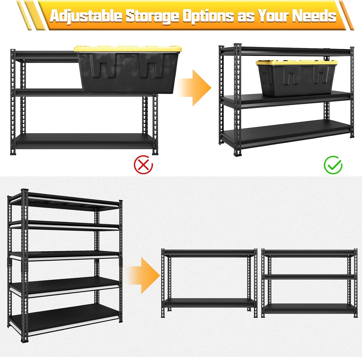 - 【Safe&Rust-Proof】The entire all-metal shelves are locked by pins to ensure crossbeams stay seated and the shelves features a total of 4 support straps to prevent twisting or spreading. Moreover industrial powder-coated finish on the steel uprights, support straps, and crossbeams, easy to clean, moisture-proof and rust-proof.