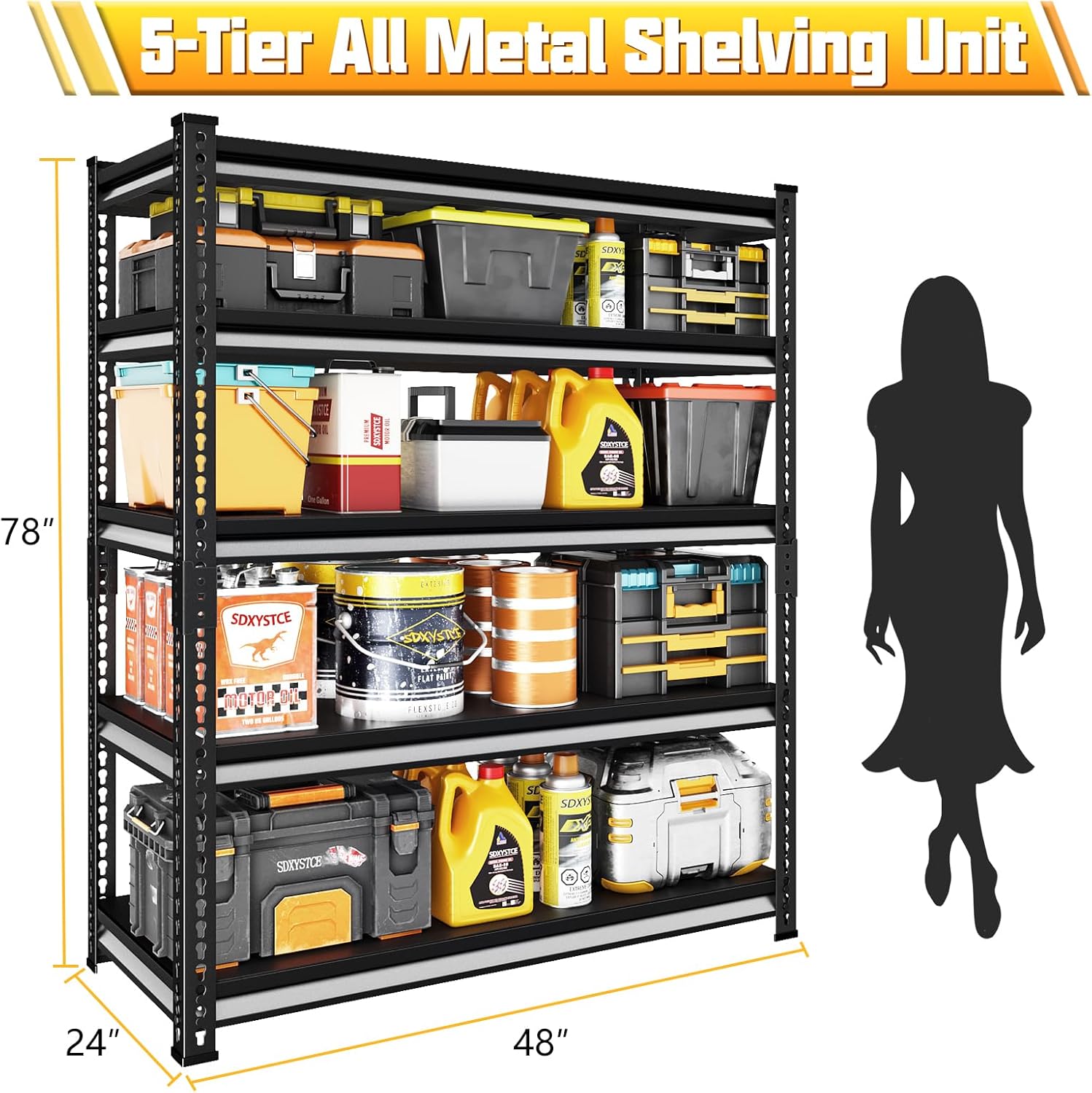 - 【3000 lbs Load Capacity】SDXYSTCE 5-tier garage organization shelves is made of heavy duty steel, every solid thickened metal shelf with 3 big ribs beneath can hold up to 600 lbs.The garage shelves heavy duty offers a high total weight capacity of 3000 lbs for organizing heavy-duty stuff and tools in your garage or warehouse.