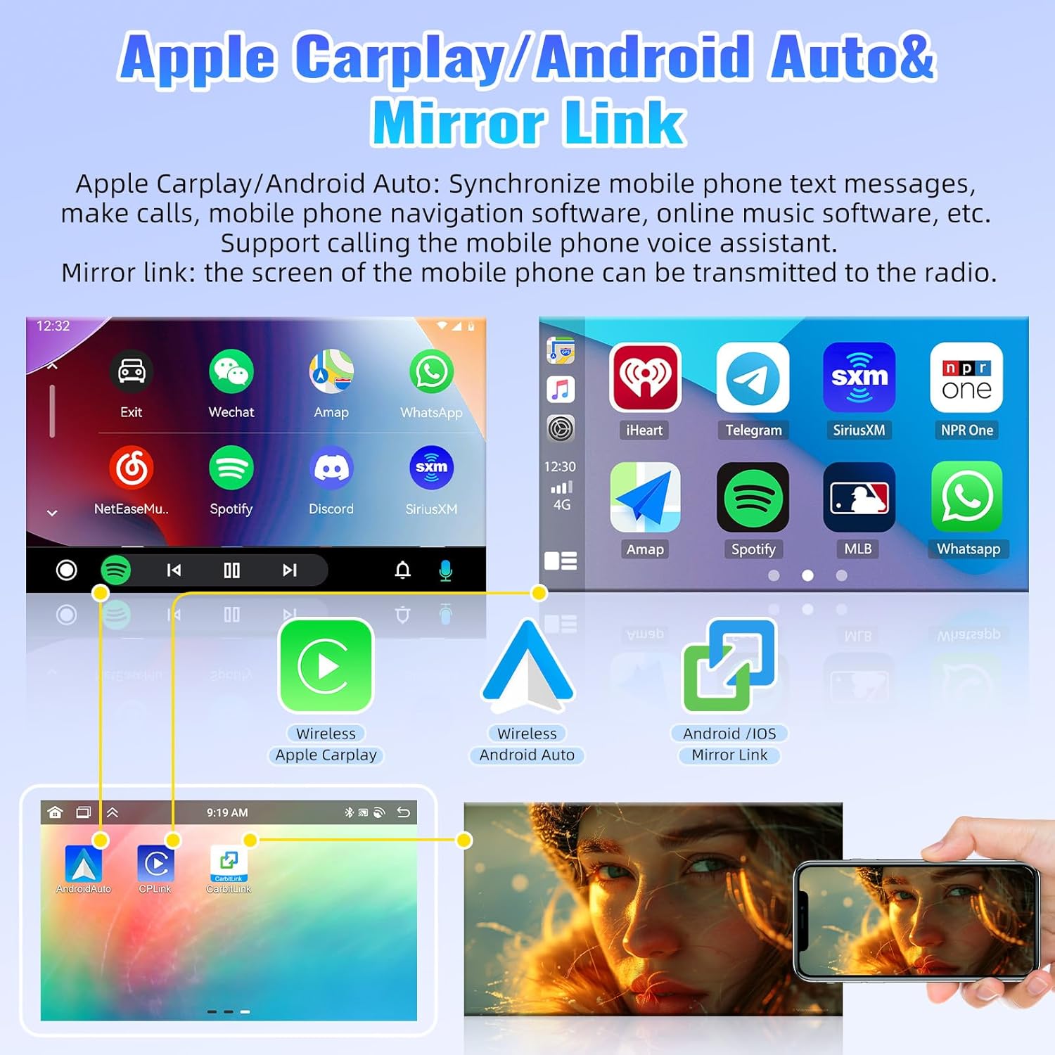 - 【Carplay, Android Auto】The android radio can synchronize the phonebook, email, notification, map navigation APP, music APP on the phone to the radio, and support call mobile phone voice assistant for voice control. Keep the mobile phone WiFi switch on. Connect Bluetooth, Open the [CPLINK]/[Android Auto] APP to automatically connect. Or use a USB cable to connect the phone and then open the [CPLINK]/[Android Auto] APP.