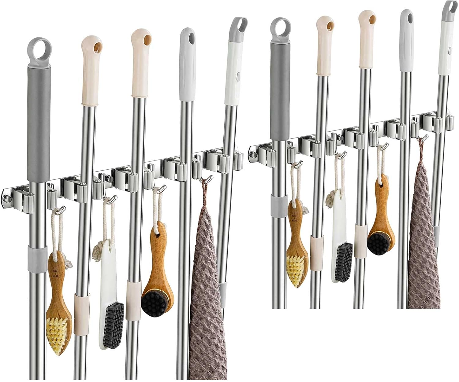 - ORGANIZE & SAVE SPACE: Featuring 5 racks and 4 hooks, this broom and mop organizer optimizes wall space, keeping your tools neatly arranged and easily accessible. It's ideal for brooms, mops, rakes, garden tools, and more, ensuring your garage, kitchen, bathroom, or laundry room stays clutter-free. The extra hooks provide additional hanging space for various items