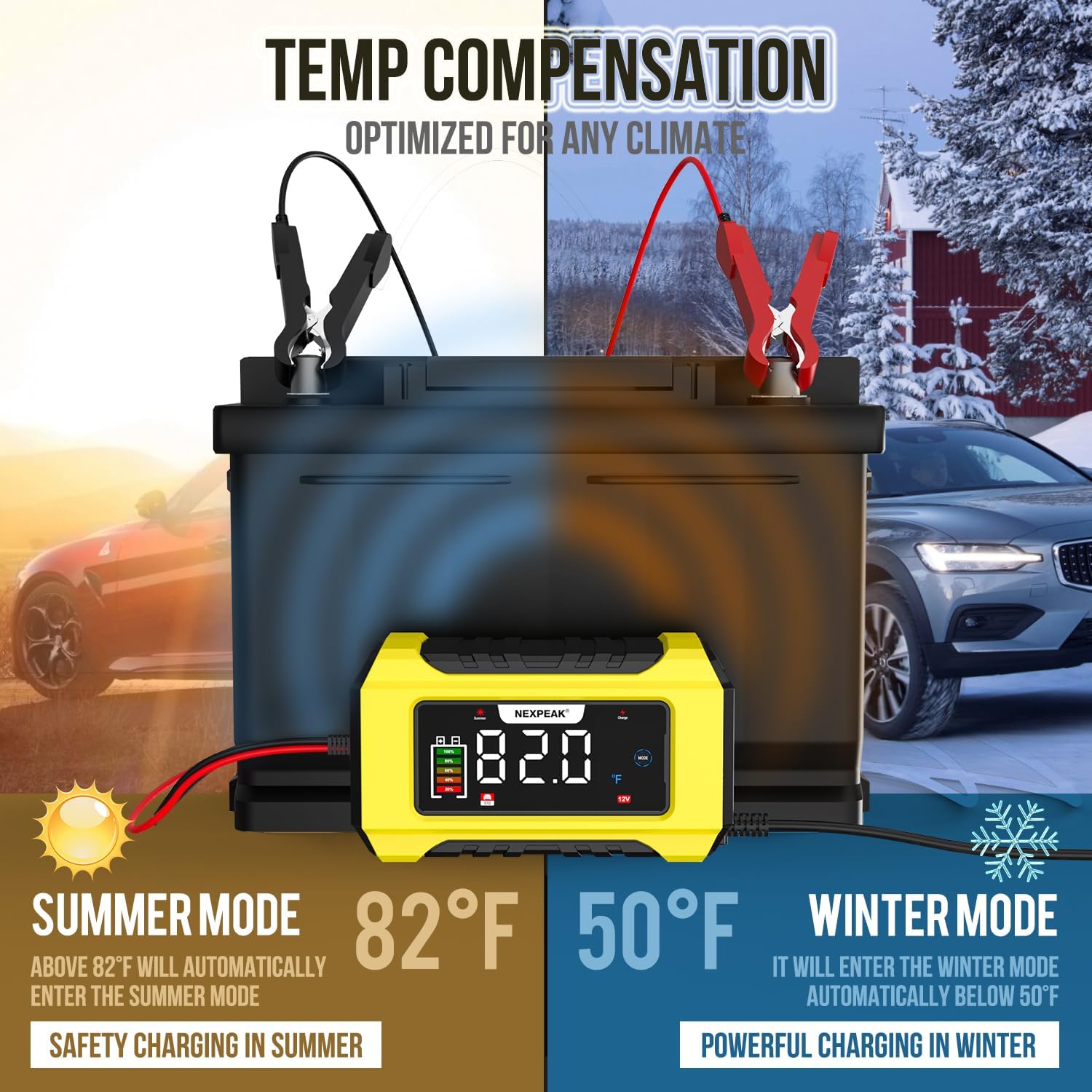 - 【OVERALL CHARGING PROTECTIONS】Smart control, temp compensation in hot climates and under-charging in cold climates, reverse protection, cooling system, overcurrent, fireproof material, overvoltage, short circuit. Battery trickle charger with multiple protection ensure the safety charging at anytime anywhere. No worries!