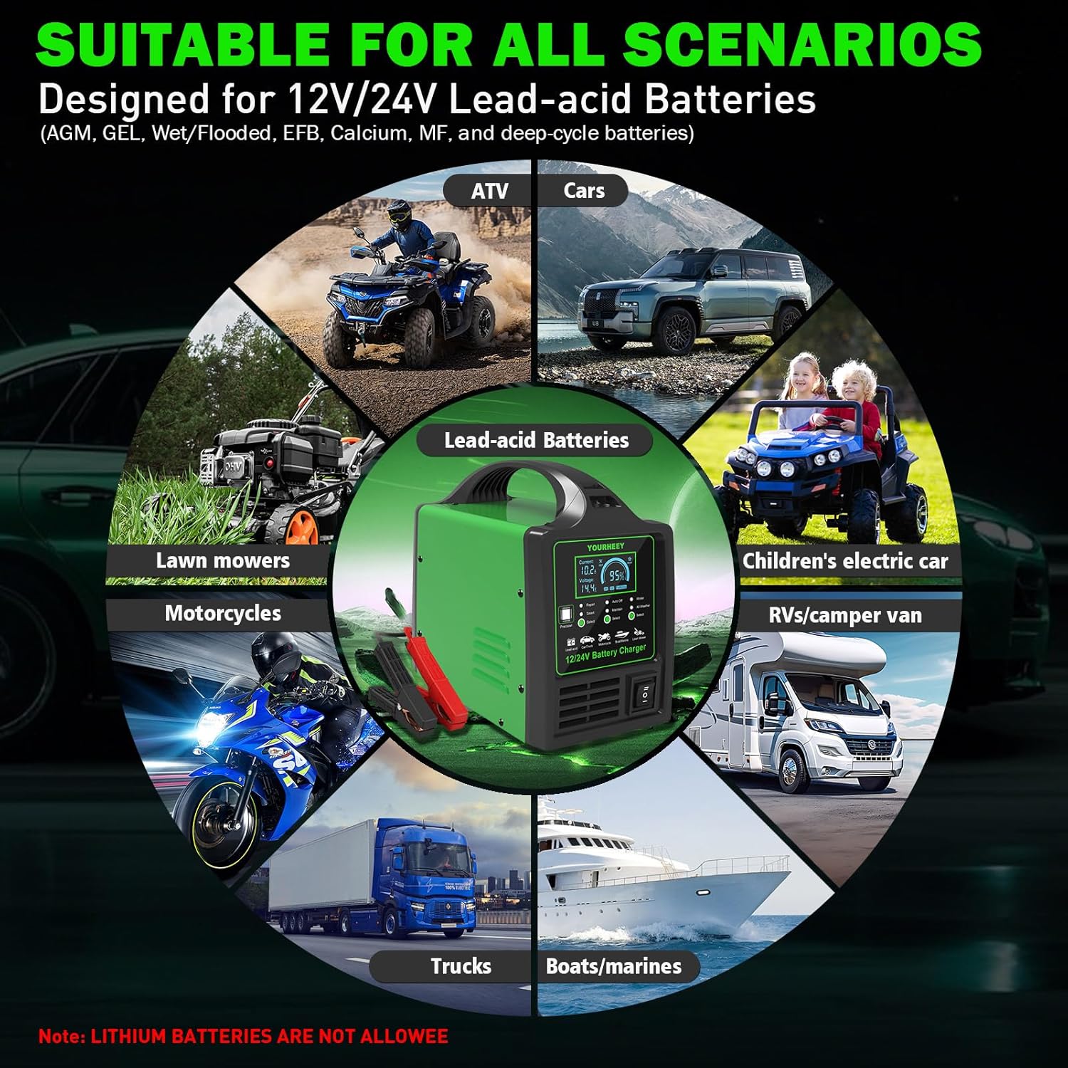 - 【Professional-Grade Battery Charger】Engineered with military-grade 13.1LB pure copper coils and heavy-duty aluminum alloy casing, the Yourheey Car Battery Charger delivers unmatched durability and 30% faster heat dissipation. This 12V 24V Battery Charger Automotive masterfully handles all lead-acid battery types - AGM, GEL, Flooded, EFB, Calcium, MF, and deep-cycle batteries (Note: Not compatible with lithium/LiFePO4). Its 15A max output ensures rapid charging for trucks/RVs while maintaining precision for motorcycles/lawn equipment. cargador de batería de carro