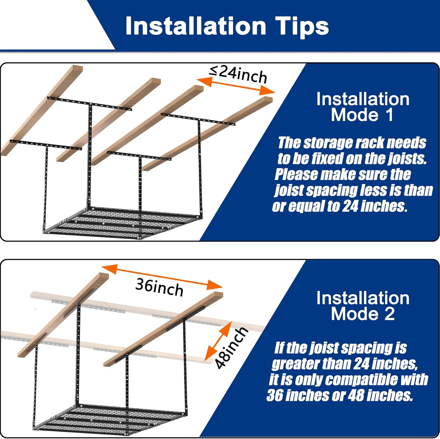 - EASY TO ASSEMBLY: Please refer to the instruction manual and install it step by step. According to the spatial characteristics of your garage, freely adjust the direction and height. Note: This ceiling storage rack is suitable for ceilings with joist spacing less than 24 inches. If the joist spacing is greater than 24 inches, it is only suitable for ceiling spacing of 48 inches.