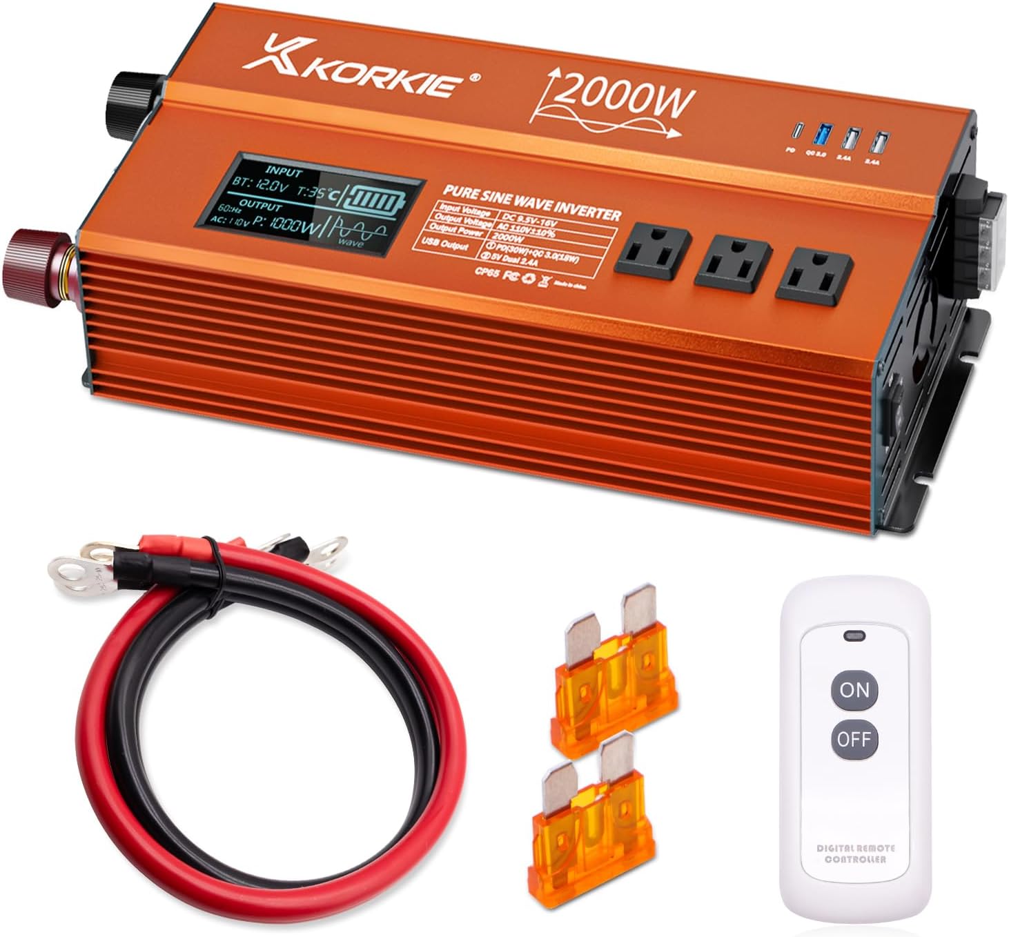 2000W Pure Sine Wave Inverter, Car Power Inverter, 12V DC to 110V, with Type-C, Dual 5.2V/2.4A USB, 3AC Outlets for Home,Camping, RV, Truck, Vehicles