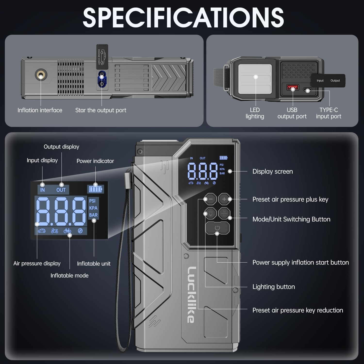 - 【Premium After-sales Service】 -- Lucklike offer 2 years warranty and lifetime technical support. If you have a problem with our product, please feel free to contact us and we will reply you within 24 hours. Lucklike portable car jump starter with air compressor have helped many people start their cars and inflate their cars, motorcycles, bicycles and other sporting goods in an emergency. We believe this car jumper starter is a great Father's Day gift, Mother's Day gift, birthday gift, Christmas gift for family and friends.