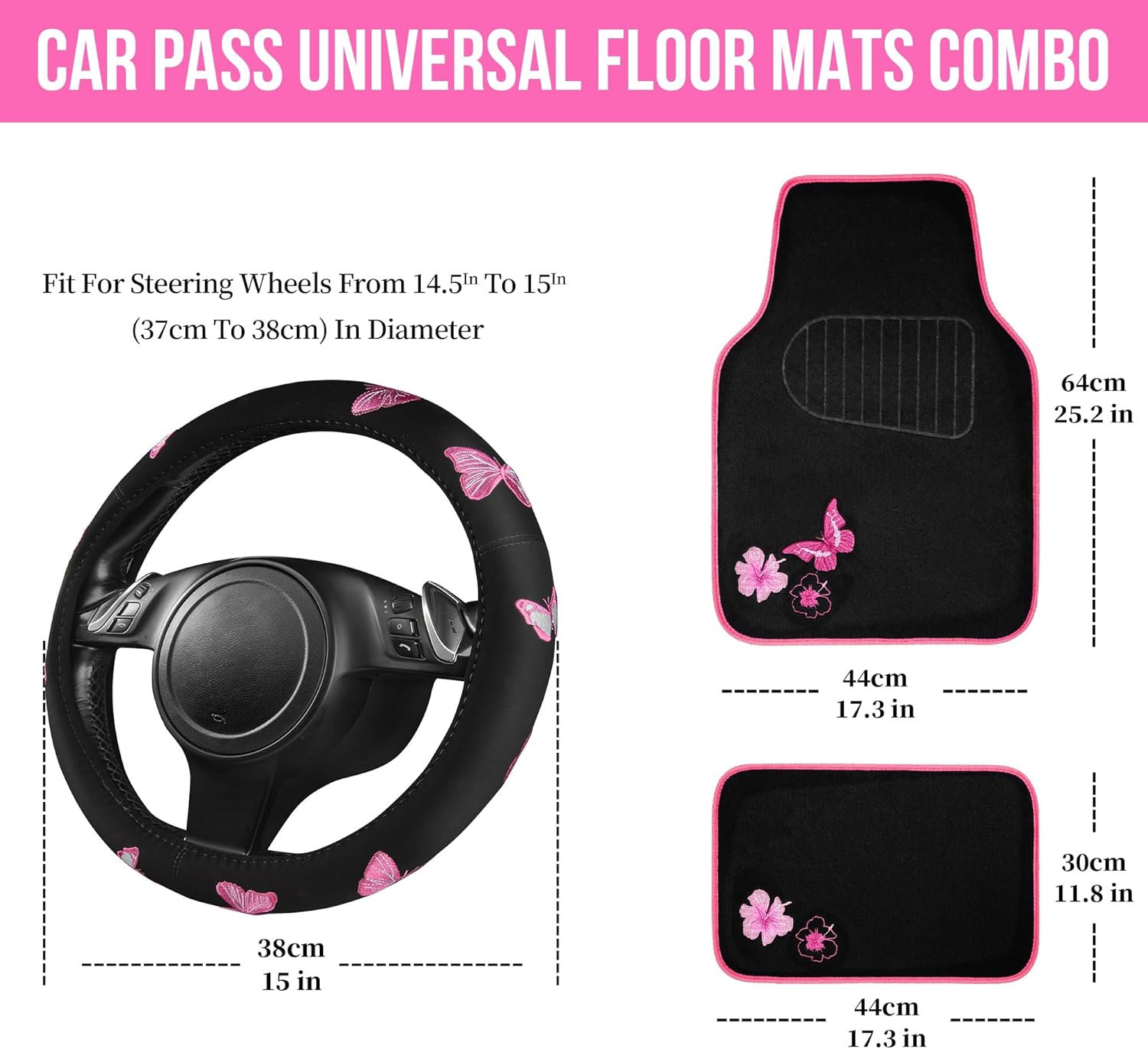 CAR PASS Embroidery Butterfly Steering Wheel Cover and Waterproof Car Floor Mats,Pink Car Mats 14.5-15inch Steering Wheel Covers Universal Fit for Cars, Suvs,Sedans,Van,for Women Girl(Black and Pink)