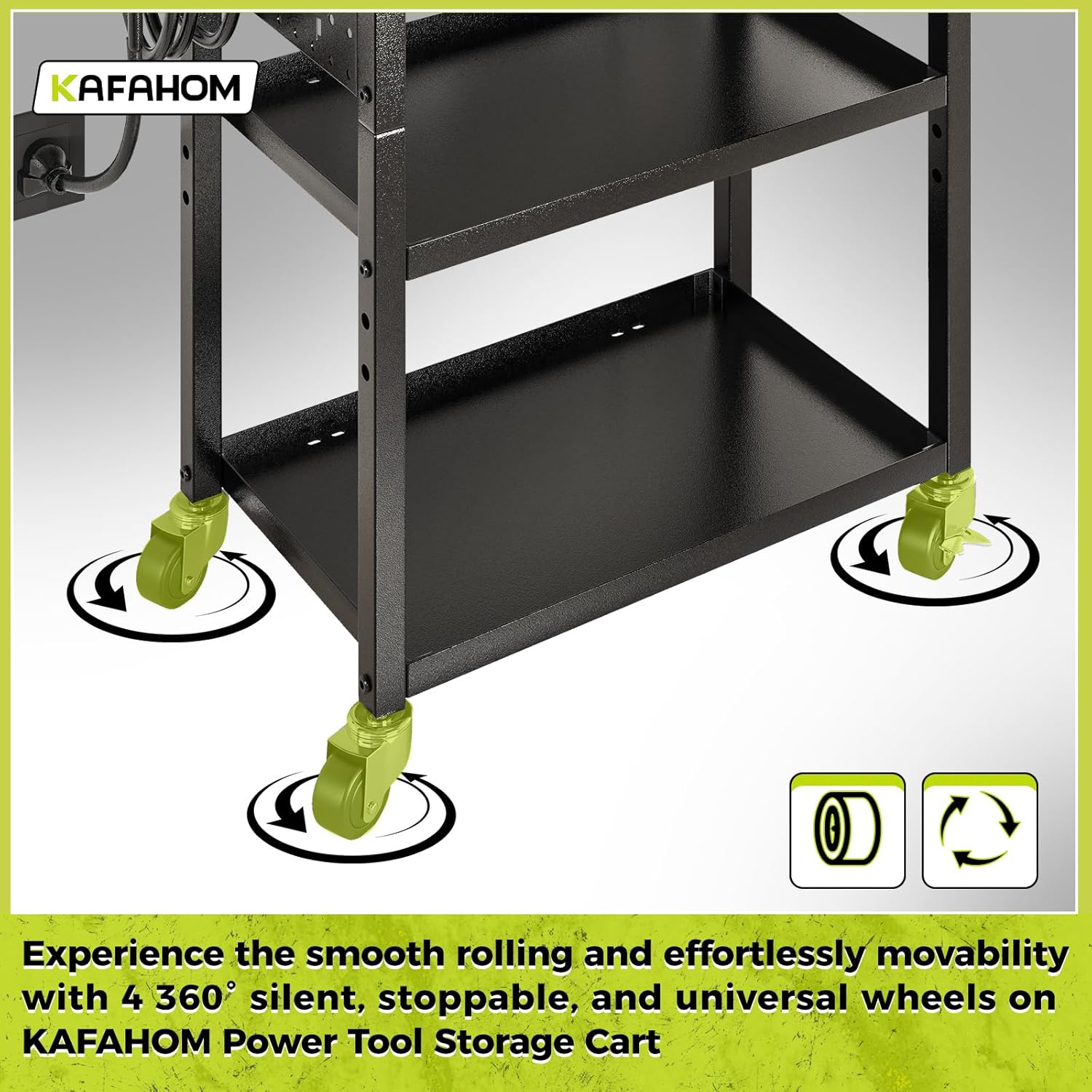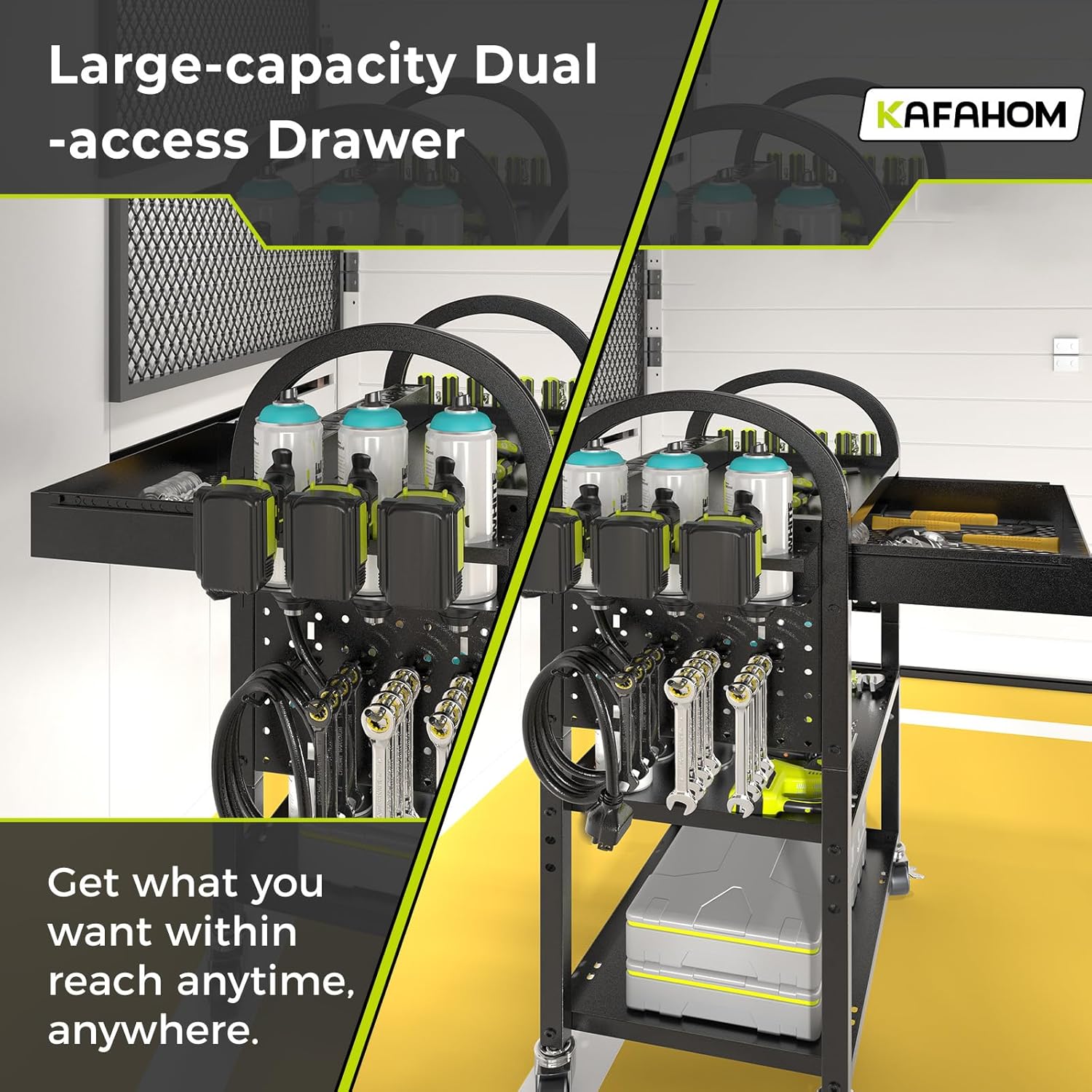 - Flexible Options: Elevate your workspace with the KAFAHOM 3-tier heavy duty metal tool storage cart. The top drawer provides abundant room and dual-side access for effortless retrieval, while the wheels enable smooth 360° silent movement. This tool organizers and storage rack for garage delivers the perfect balance of flexibility and durability.