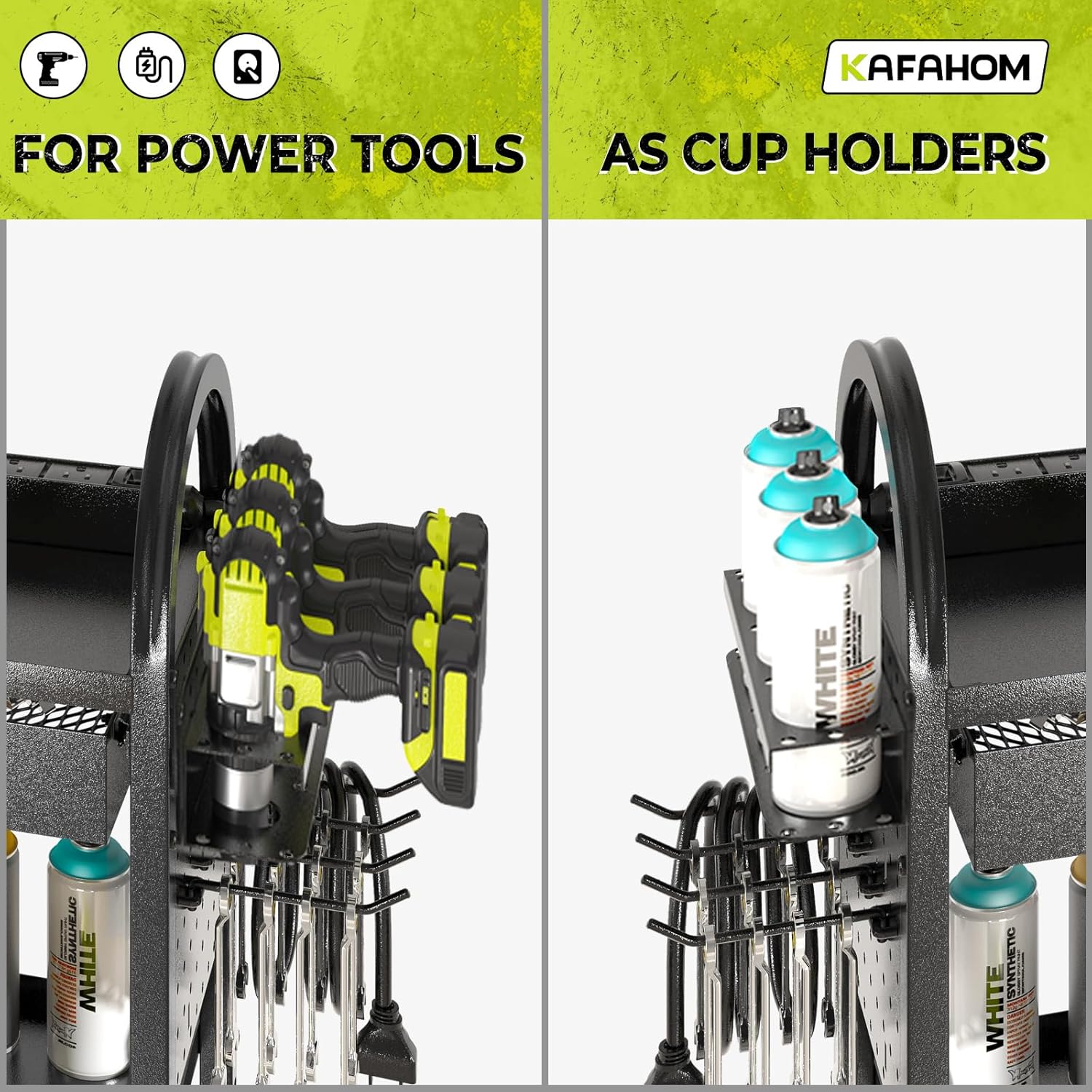 - High-Congregate Design: Enjoy excellent efficiency with our customizable features, including adjustable chargers that can be positioned on any tier, a swift-access drawer, a 3-level-available middle layer, and a spacious ground floor for large items. But that's not all—customize your setup with a side pegboard, four long hooks, a power tools rack, and a handy tools holder. At KAFAHOM, we strive for a perfectly organized environment that meets all your needs.