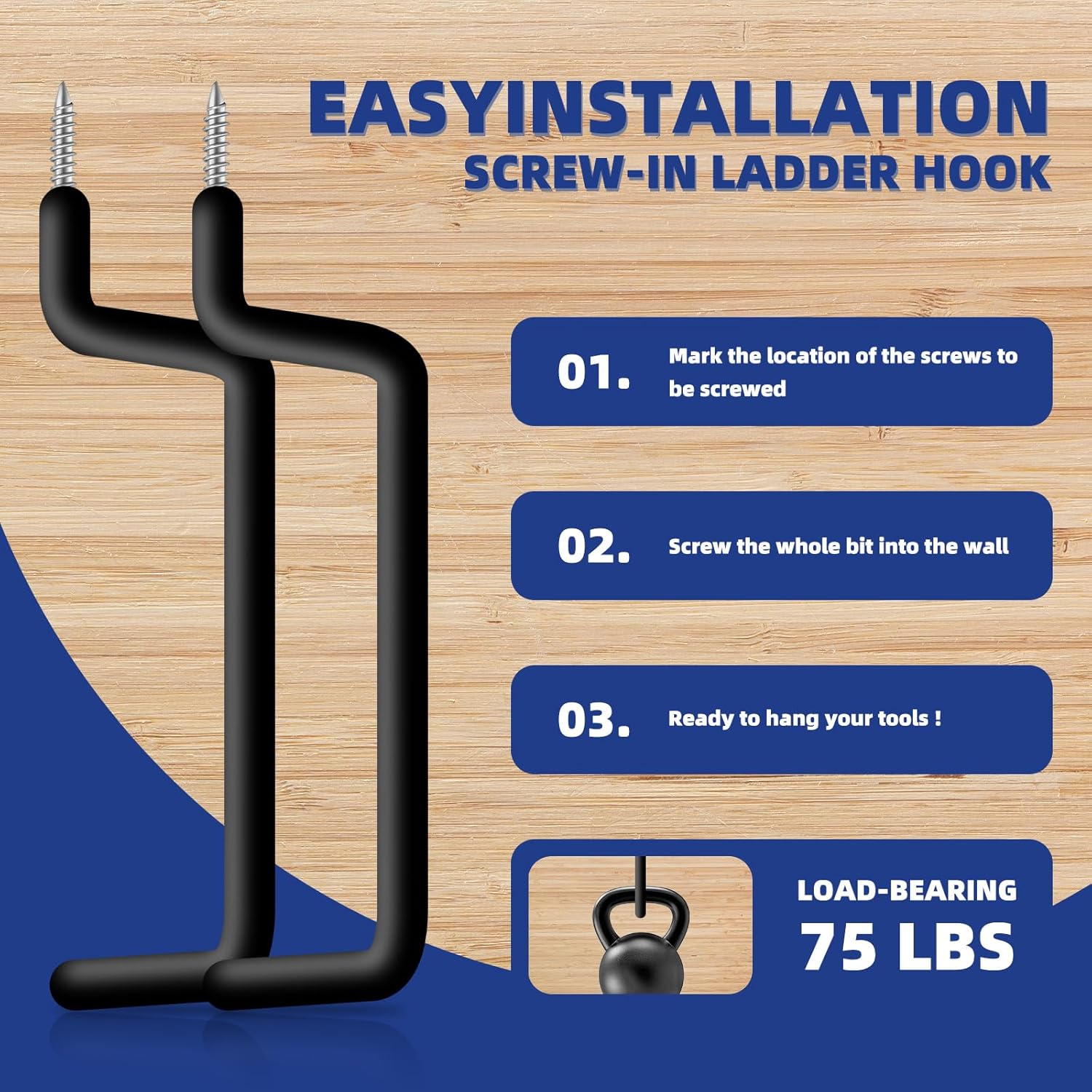 - PACKAGE INCLUDES: 10 ladder hooks, 2 different styles of hooks, each hook can hold up to 75 lbs; this provides plenty of capacity for your garage storage needs.