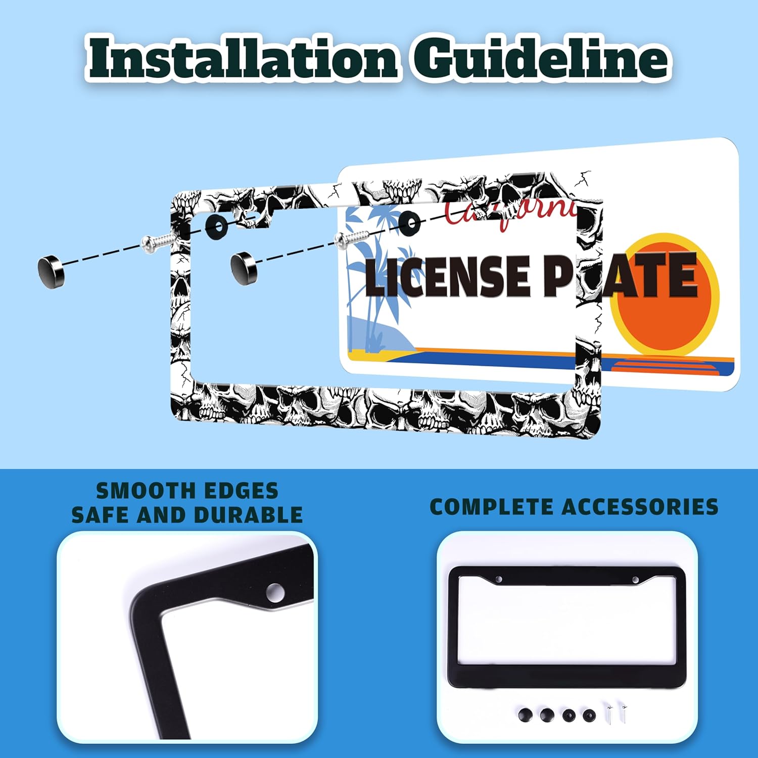 Skull License Plate Frame Black White Skeleton Stainless Steel License Plate Holder for Front or Rear Car Tags Funny for Car Decoration Accessories with Screws 6.3 X 12.2 in for Women Men