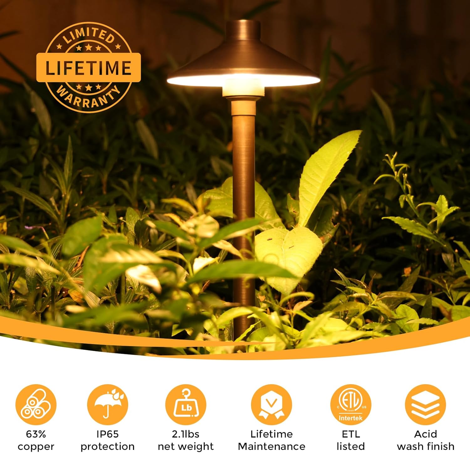 Gardencoin Solid Brass Low Voltage Pathway Lights (6.7'' Shade, 21.9'' Tall), 12V AC/DC Heavy Duty LED Landscape Path Lights Outdoor Wired, Antique Bronze Walkway Lights with Larger Stake, 6-Pack