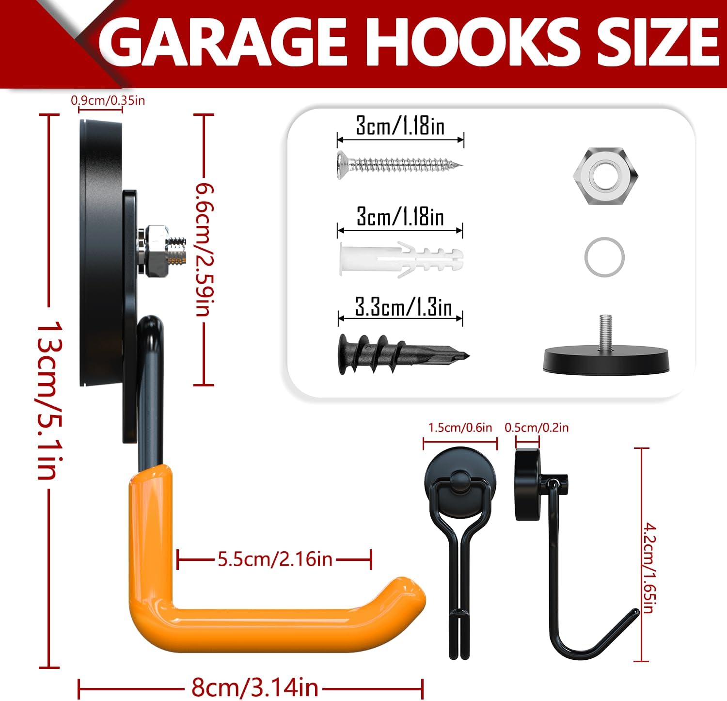 - Easy To Install Strong Heavy Duty Hooks: 2 usage options available: (1) heavy duty magnetic hooks for garage can be adsorbed on any metal surface. No tools, drilling, or screws are required for installation, ensuring no damage to the surface. (2) Alternatively, you can remove the magnet and use the garage storage hooks independently. For storing heavier tools, we provide sturdy screws that can be used to securely install the heavy duty hooks for garage on any wall surface