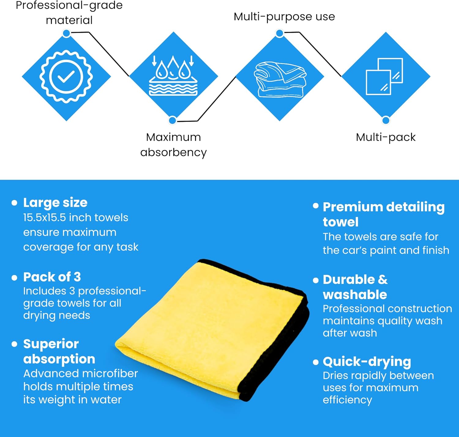 - Highly absorbent microfiber: The car drying towel is crafted from premium microfiber, engineered to maximize absorbency. Each towel can hold several times its weight in water, outperforming traditional cotton towels. The superior absorption power means faster drying times and less effort.